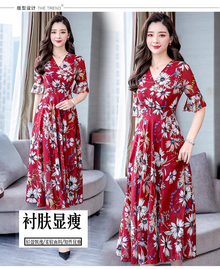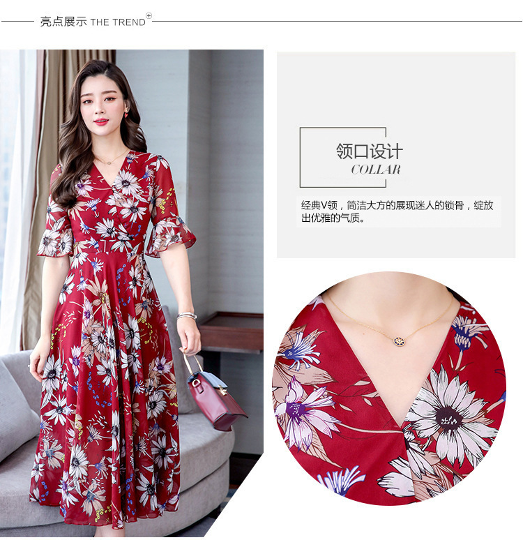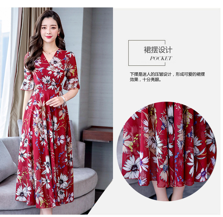 여름 여성용 플로럴 오버 더 니 원피스 여성용 프린트 원피스 중간 길이 브이넥 반팔 원피스 플레어 슬리브 A-라인 원피스