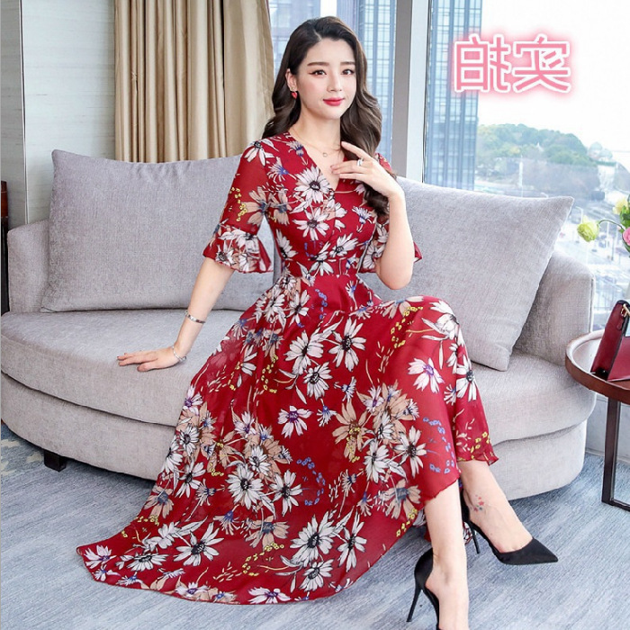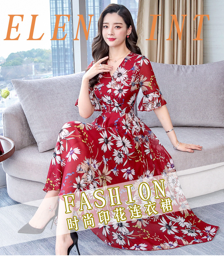 여름 여성용 플로럴 오버 더 니 원피스 여성용 프린트 원피스 중간 길이 브이넥 반팔 원피스 플레어 슬리브 A-라인 원피스스토어 가기