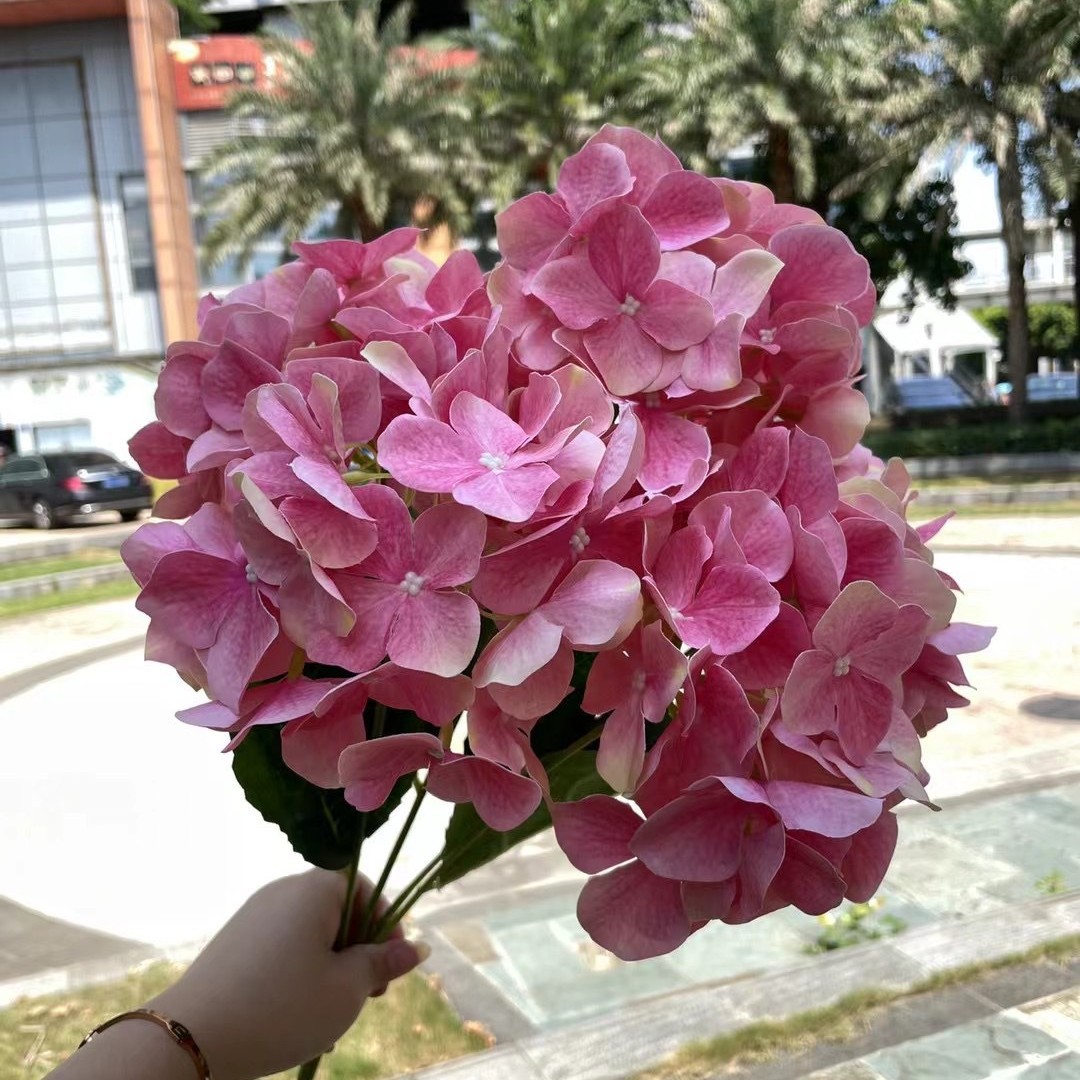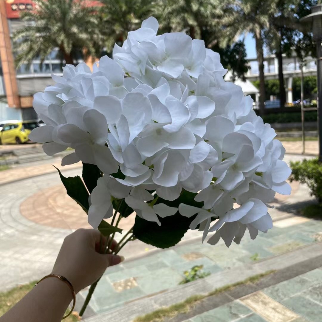 【规格】:整束长度约47cm,总宽度约27cm, 5个大绣球花头,1个花头有27片花瓣,单片绣球花瓣直径约7cm,单个绣球花头直径约16cm,带仿真玫瑰叶