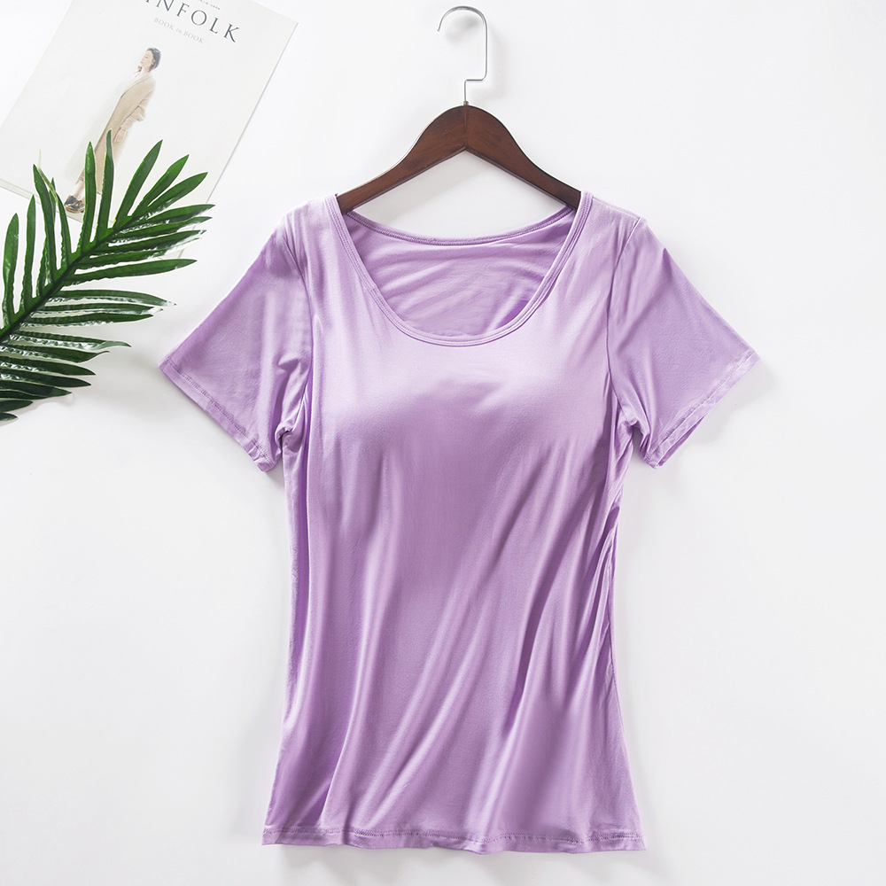 가슴 패드가 있는 모달 반팔 티셔츠 여성용 컵 원피스 솔리드 컬러 브라 프리 요가 홈베이스 스포츠 탑