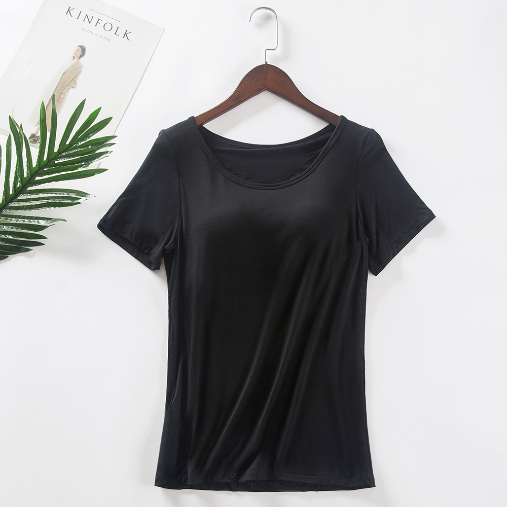 가슴 패드가 있는 모달 반팔 티셔츠 여성용 컵 원피스 솔리드 컬러 브라 프리 요가 홈베이스 스포츠 탑스토어 가기