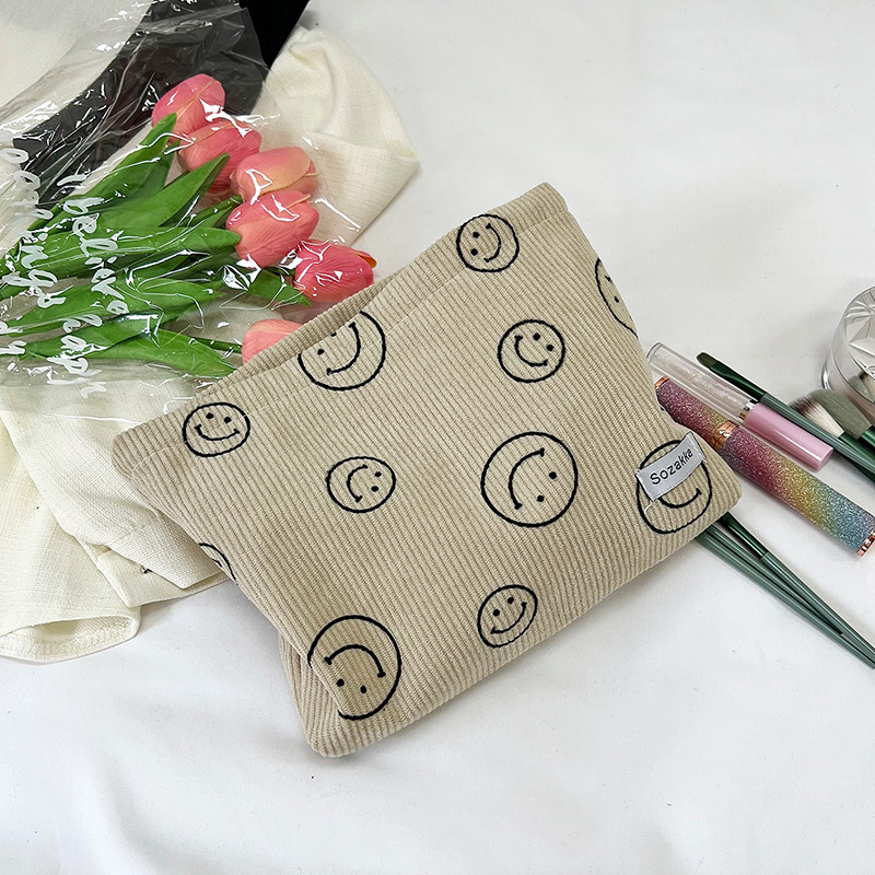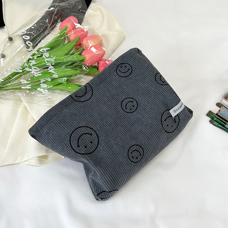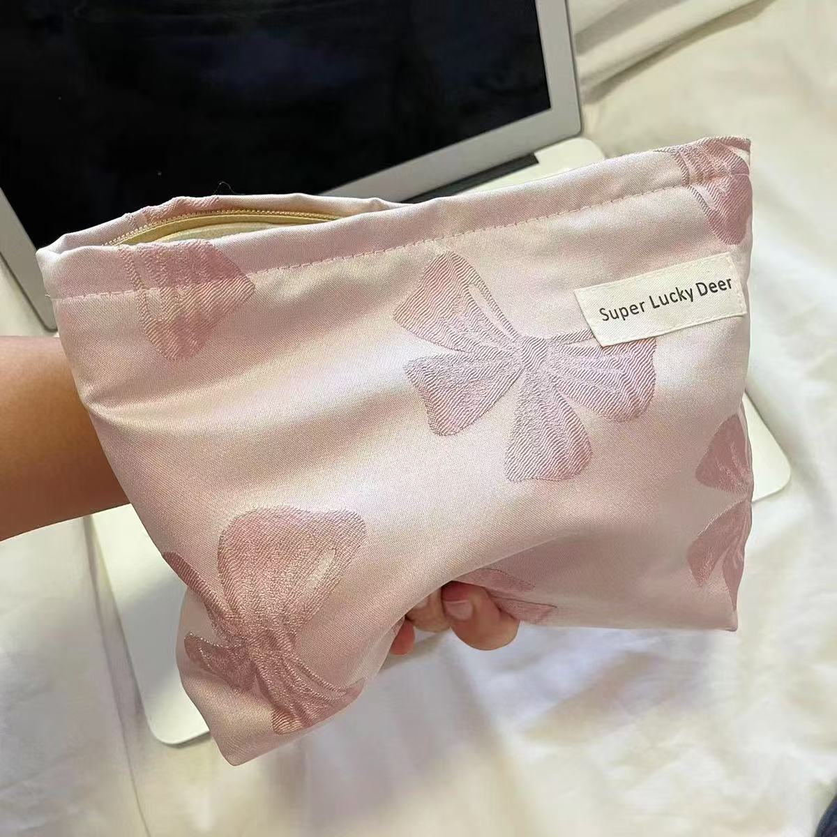 • 회색 배경에 검은색 리본이 달린 화장품 가방
