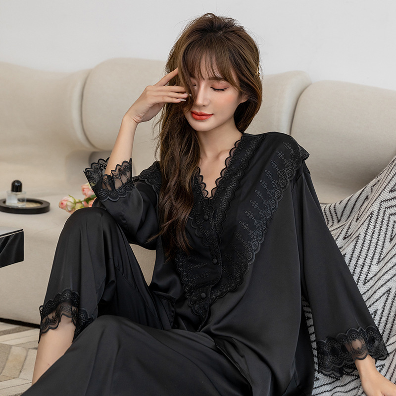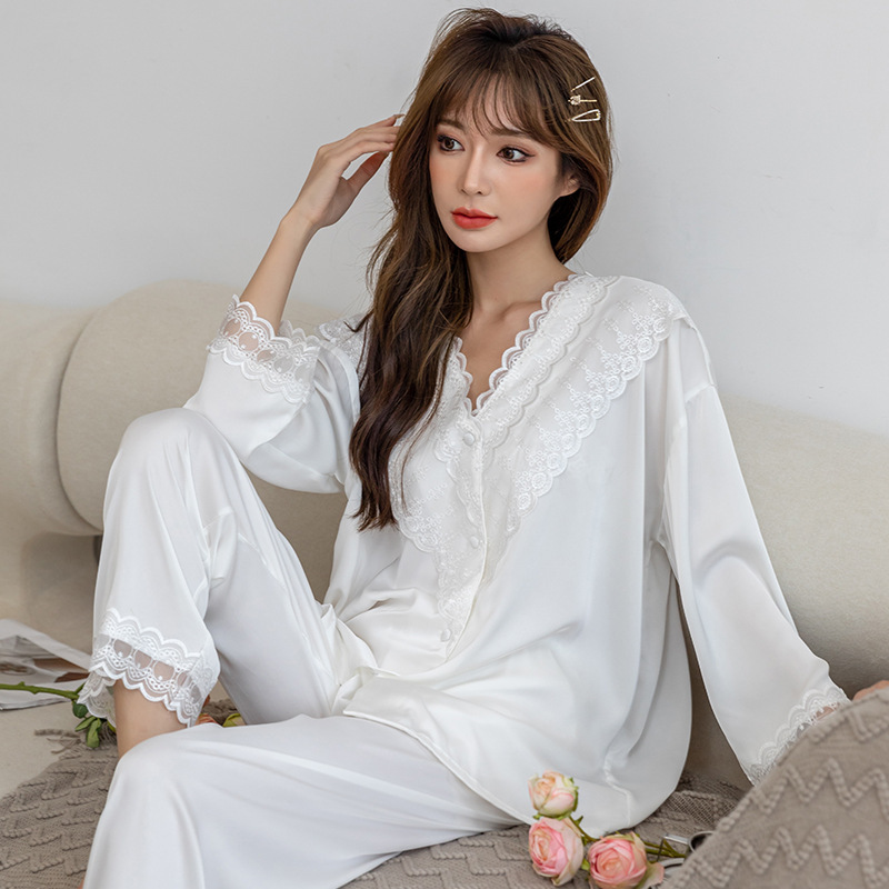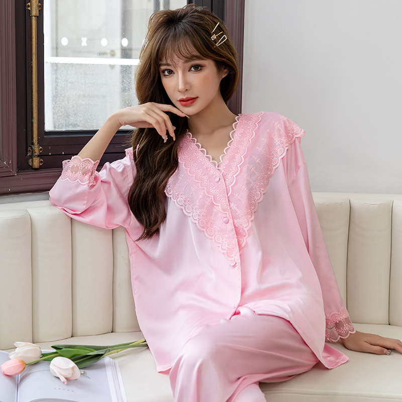 유럽식 잠옷 여성용 봄 2022 새로운 심플 스타일 투피스 세트 여성용 가을 스타일 아이스 실크 홈 의류