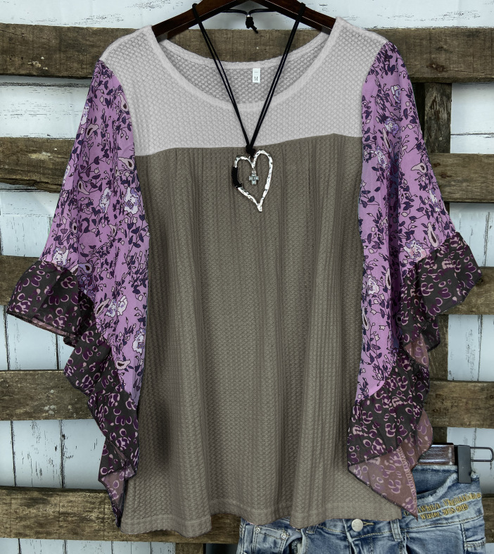 2022 크로스 보더 유럽과 미국 아마존 여성의 봄과 여름 소원 박쥐 소매 인쇄 컬러 매칭 와플 탑 티셔츠 여성스토어 가기