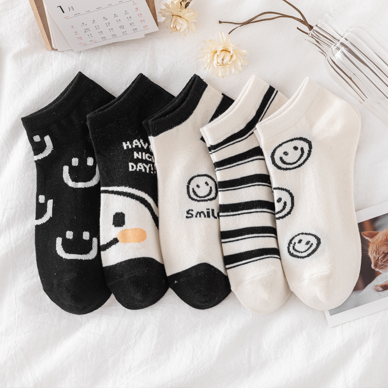 트렌디 한 흑백 일본 달콤한 만화 스포츠 양말 캐주얼 여성용 보트 양말에 개인화 된 봄 새로운 스마일 짧은 양말