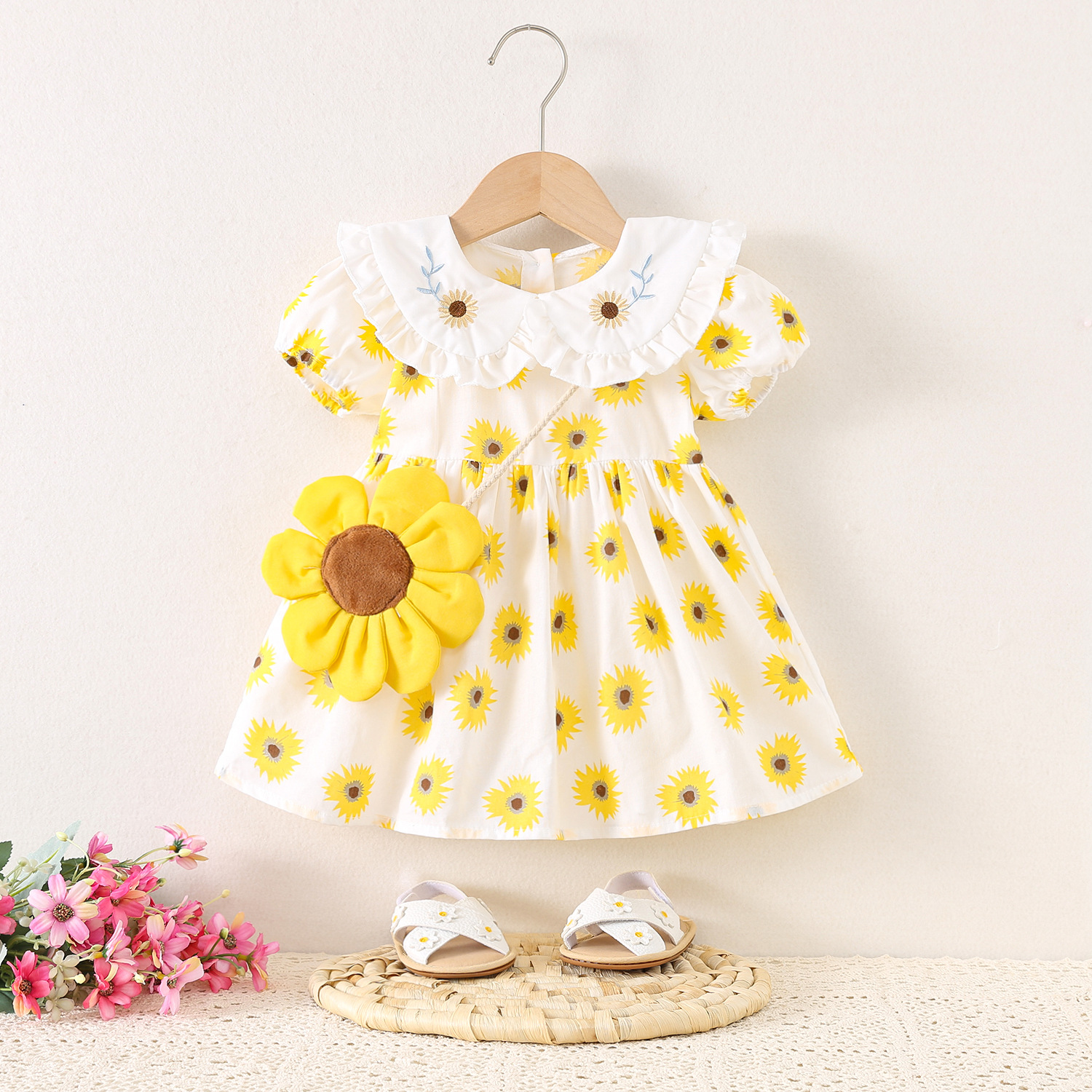 1424 여름 새로운 여아 반팔 원피스 공주 스커트 전체 길이 해바라기 면 천 스커트 배달 가방스토어 가기