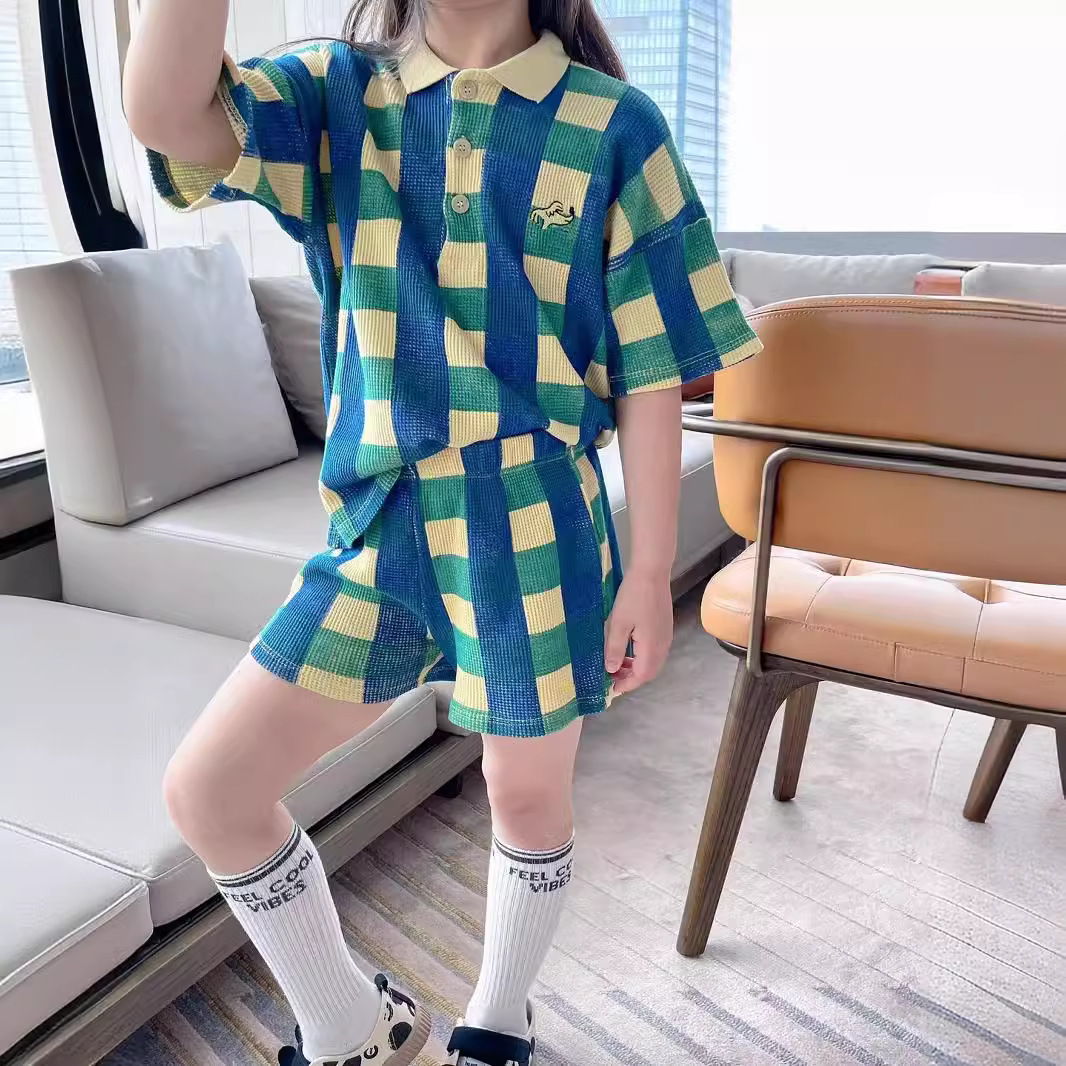 [재고] 새로운 파란색, 녹색 및 노란색 대비 검사 전체 인쇄 반바지 중립