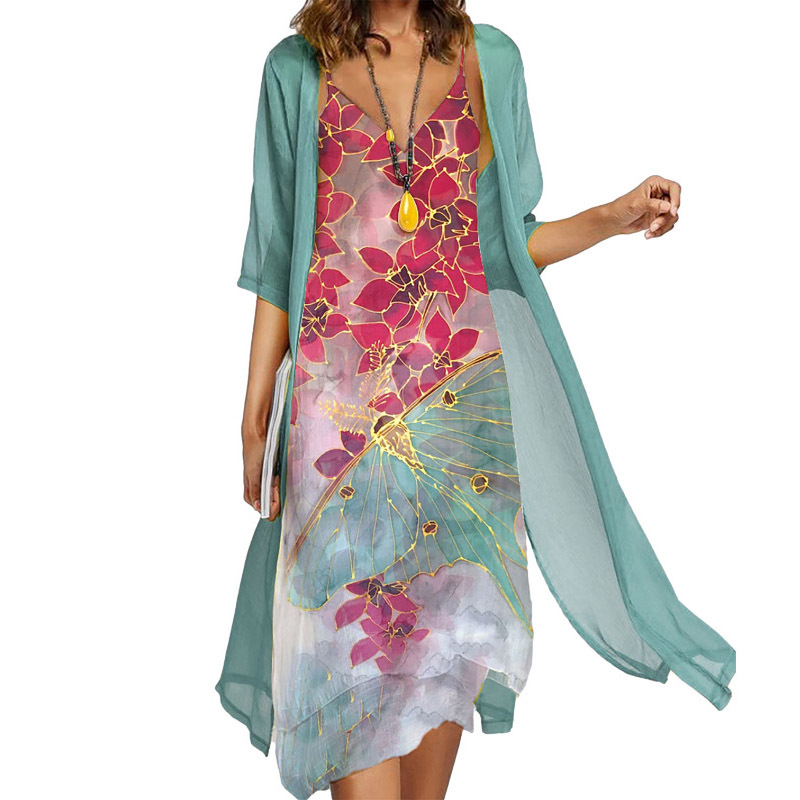 2023 유럽과 미국의 아마존 봄과 여름 새로운 여성 원피스 꽃 프린트 둥근 목 짧은 소매 쉬폰 셔츠 투피스 세트