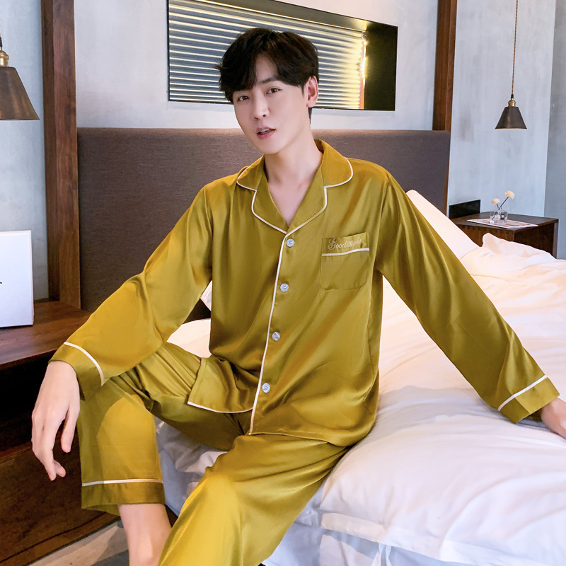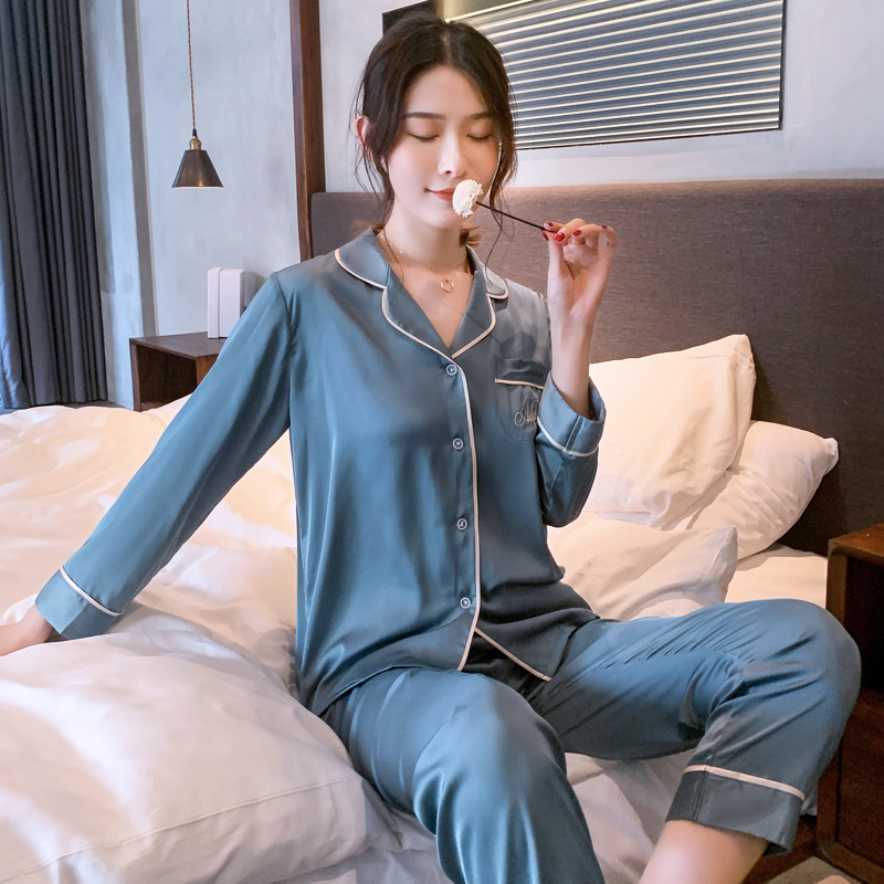 커플 잠옷 남자의 봄과 여름 모조 실크 아이스 실크 긴팔 가정복 여자의 봄과 가을 얇은 투피스 세트스토어 가기