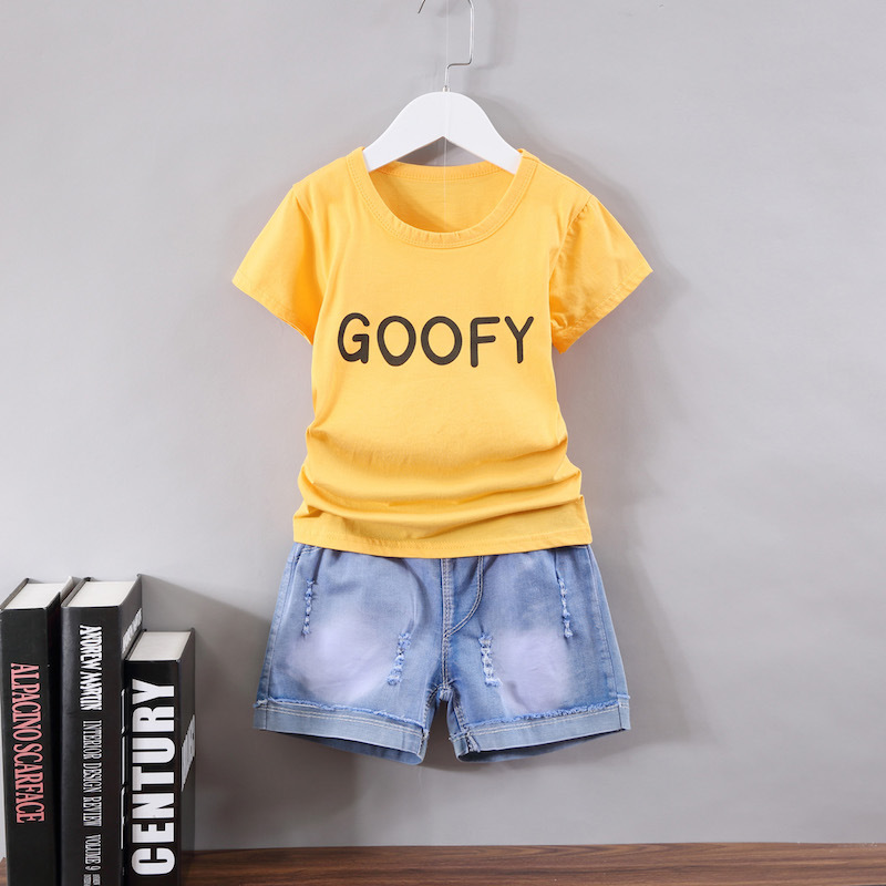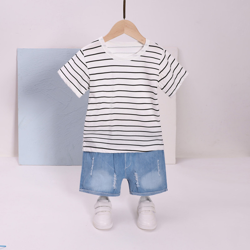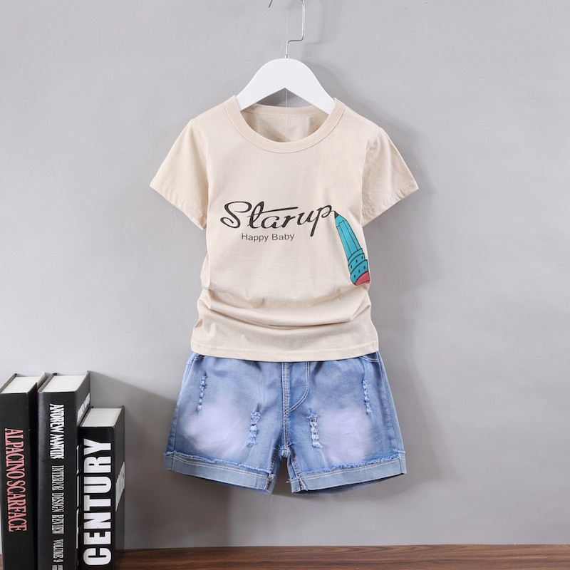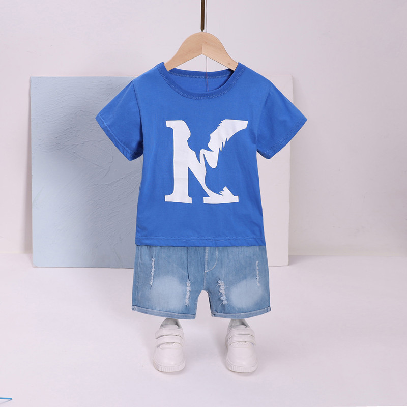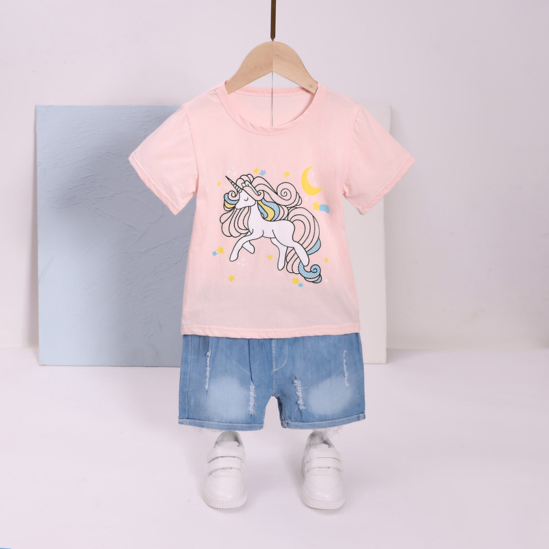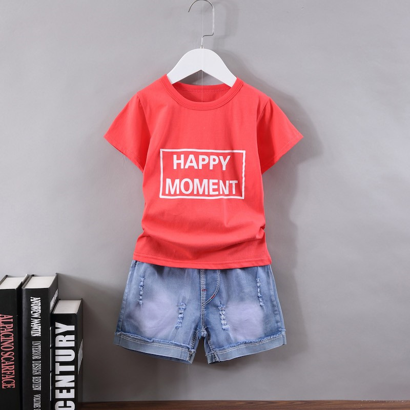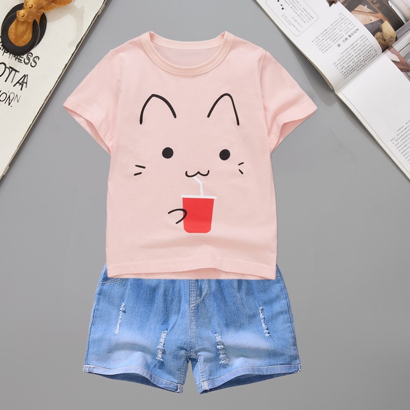 어린이 세트 여름 학생 여아 아동복 면 tT 티셔츠 반팔 투피스 여름 찢어진 데님 반바지스토어 가기