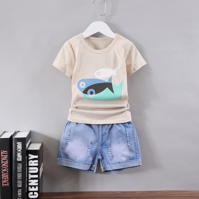 • 카키 작은 물고기 짧은 소매 + 반바지 (세트)