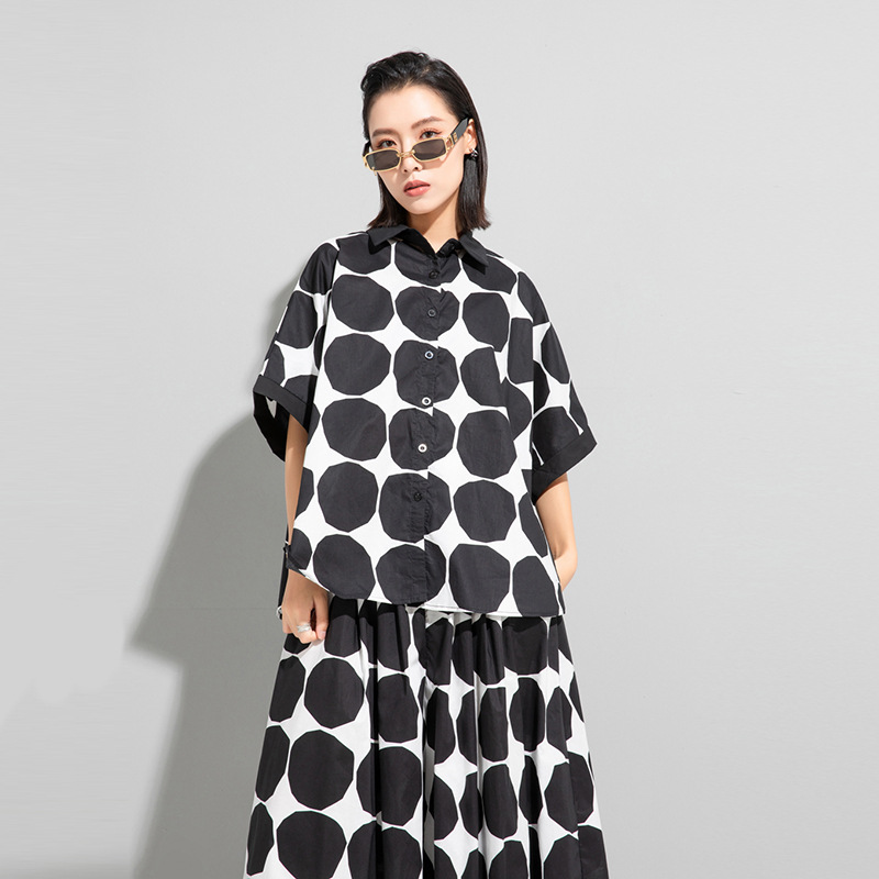 유럽과 미국 스트리트 다크 느슨한 플러스 사이즈 여성 의류 새로운 폴로 도트 옷깃 셔츠 박쥐 소매 셔츠 여성의 탑스토어 가기