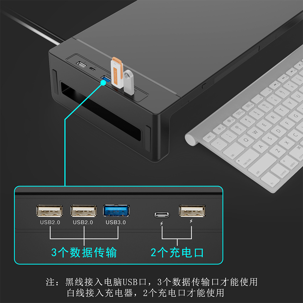 1:黑色数据线1.5米接电脑USB口,输出5V1A,接鼠标、键盘、U盘等;