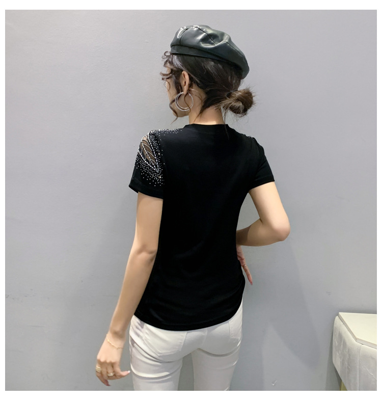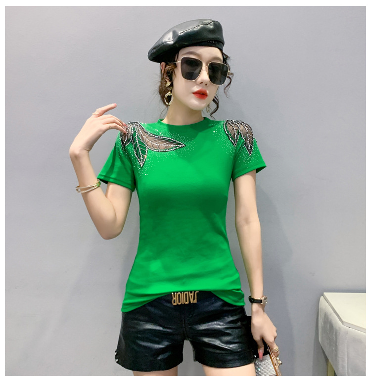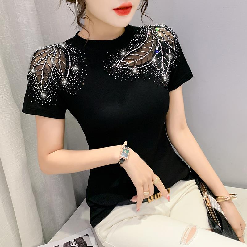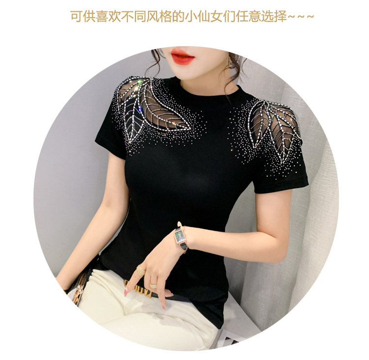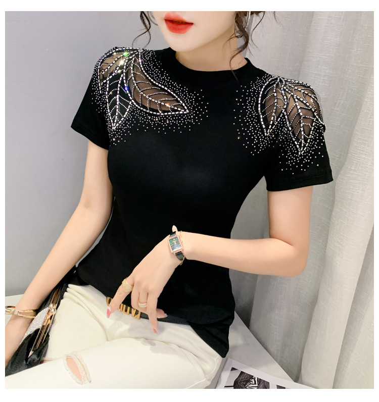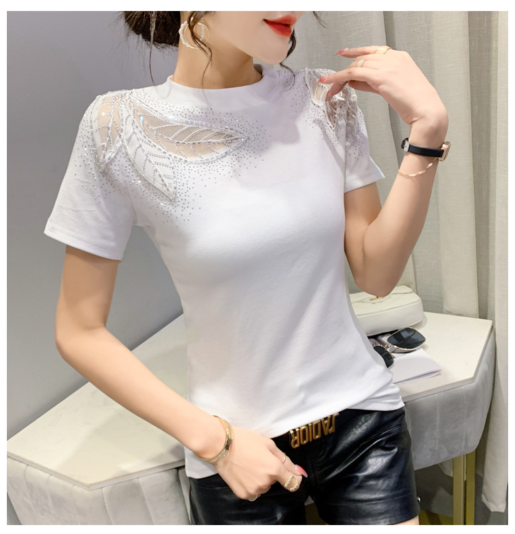 실제 샷 2024 유럽 역 봄과 여름 새로운 반팔 라운드 넥 패션 중공 레이스 핫 다이아몬드 슬림 슬림 티셔츠 여성용스토어 가기
