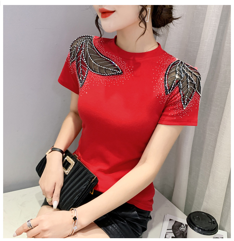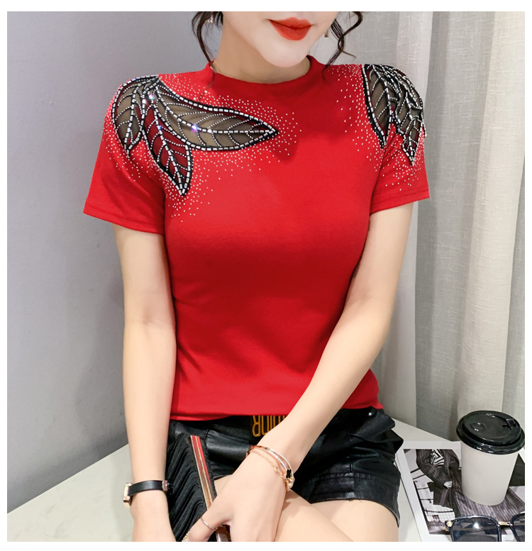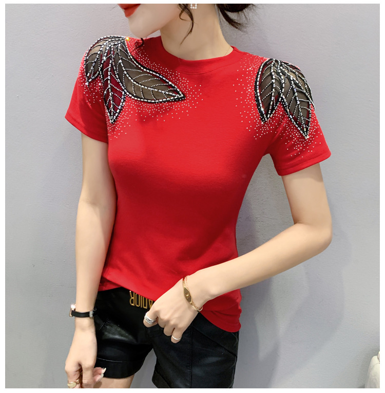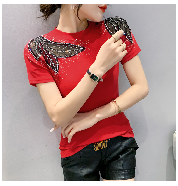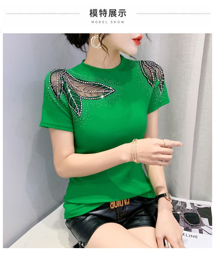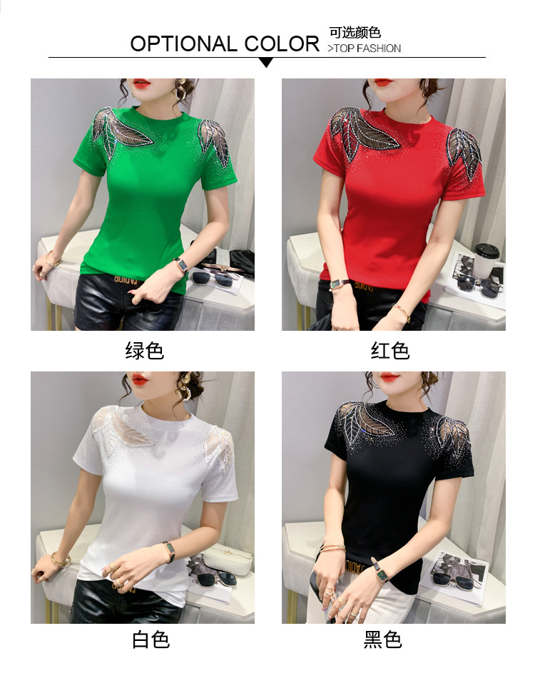 실제 샷 2024 유럽 역 봄과 여름 새로운 반팔 라운드 넥 패션 중공 레이스 핫 다이아몬드 슬림 슬림 티셔츠 여성용스토어 가기