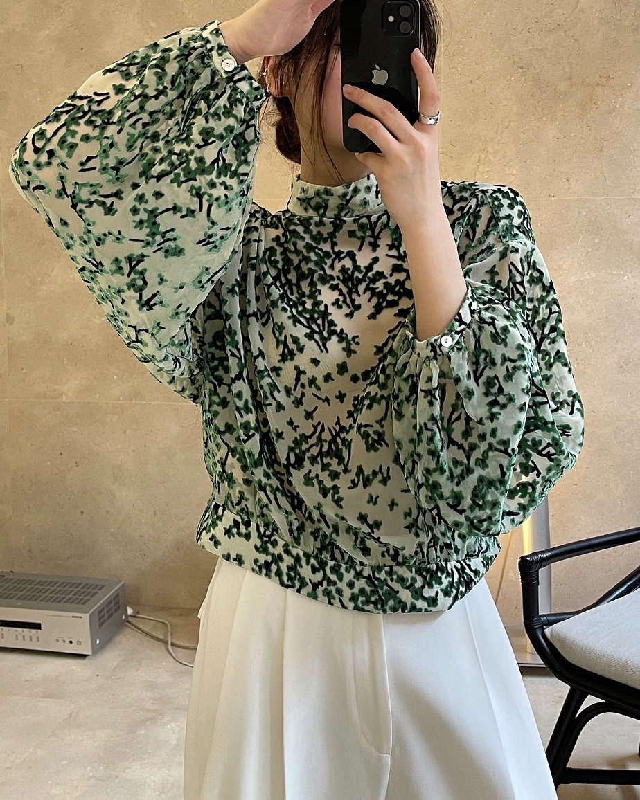 "개인" 봄 새로운 한국 스타일 레트로 하프 하이 칼라 랜턴 슬리브 몰려 인쇄 셔츠 캐주얼 최고 여성