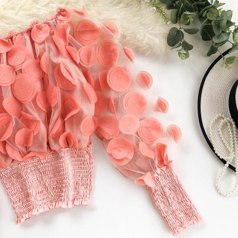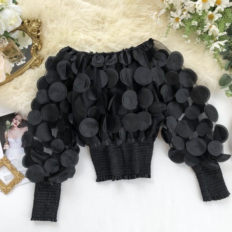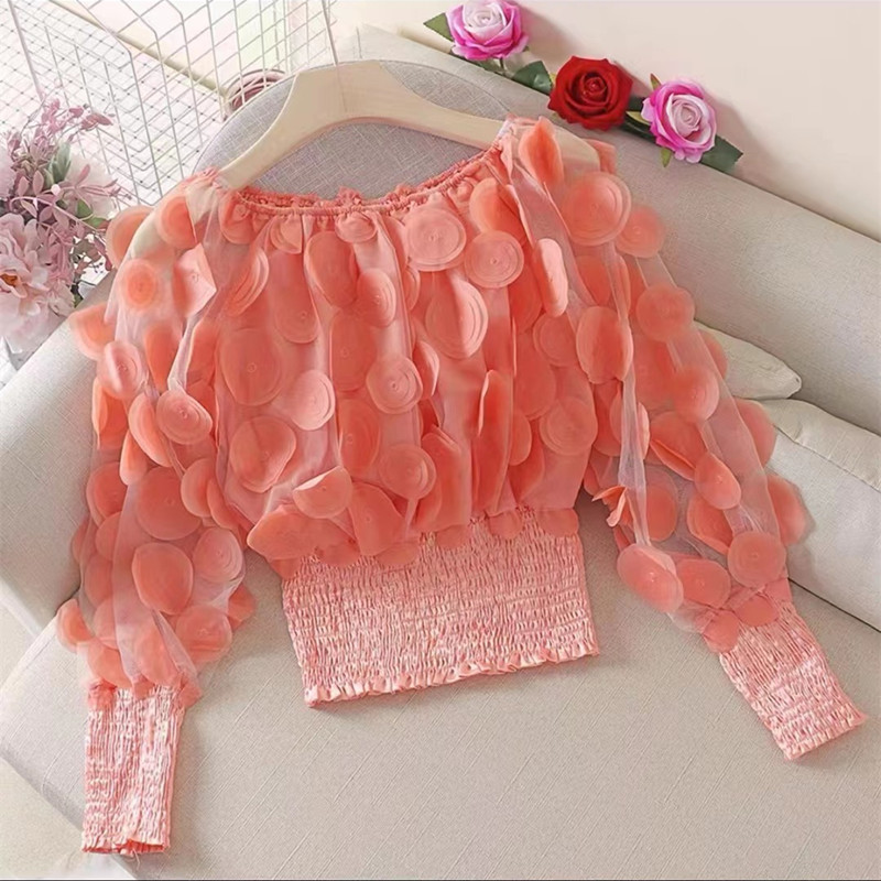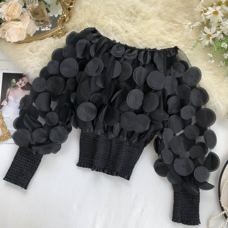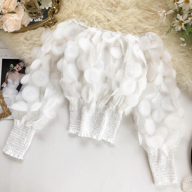 오프 숄더 허리 탑 여성의 틈새 디자인 감각 패션 입체 꽃 외국 스타일 버블 슬리브 원근감 메쉬 쉬폰 셔츠