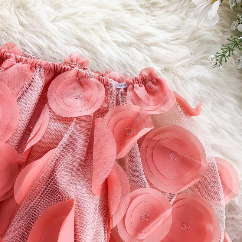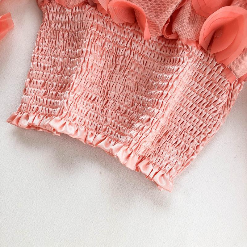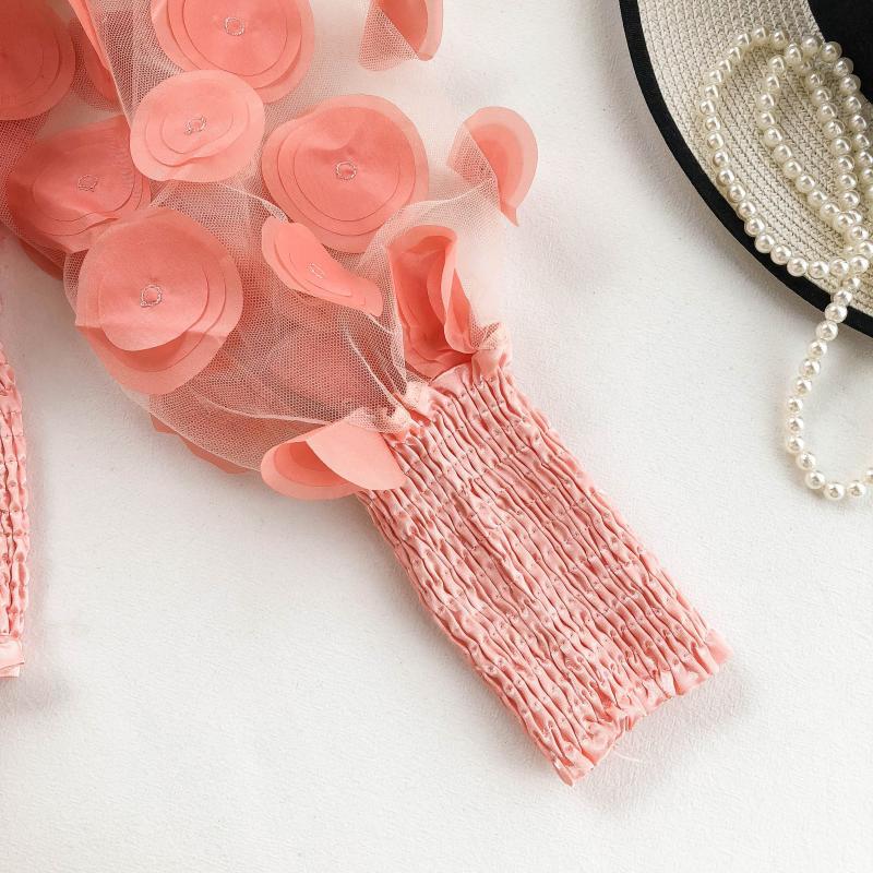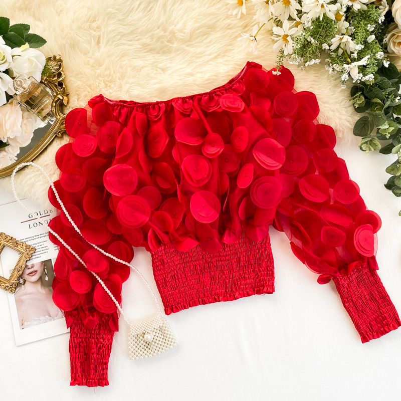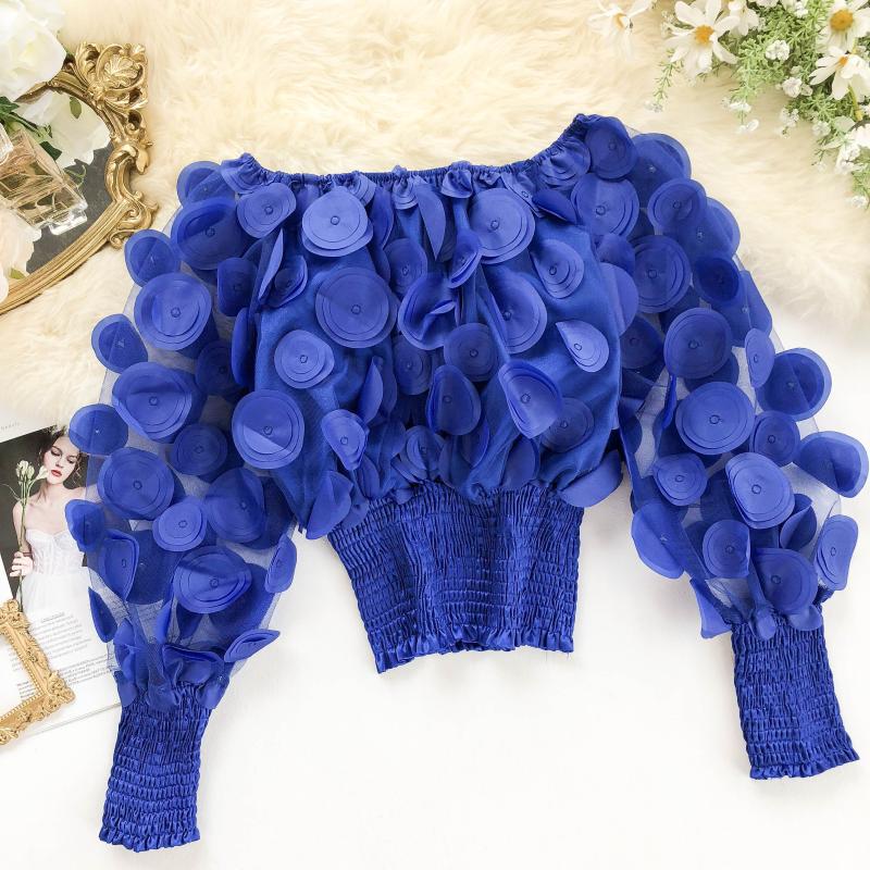 오프 숄더 허리 탑 여성의 틈새 디자인 감각 패션 입체 꽃 외국 스타일 버블 슬리브 원근감 메쉬 쉬폰 셔츠