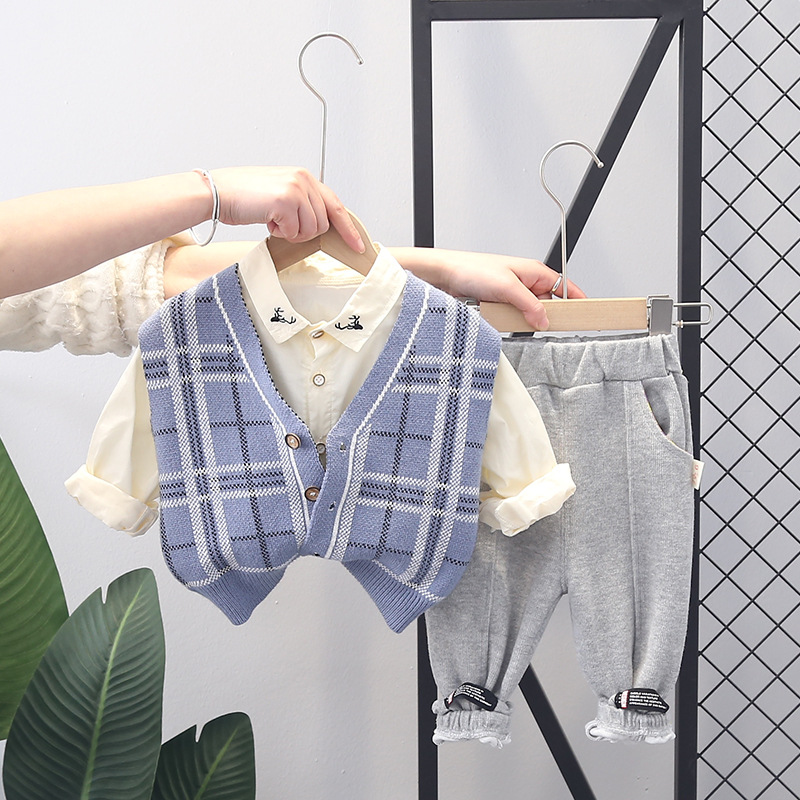 2022 봄과 가을의 새로운 어린이 가을 격자 무늬 스웨터 카디건 3 피스 베이비 캐주얼 스웨터 조수스토어 가기