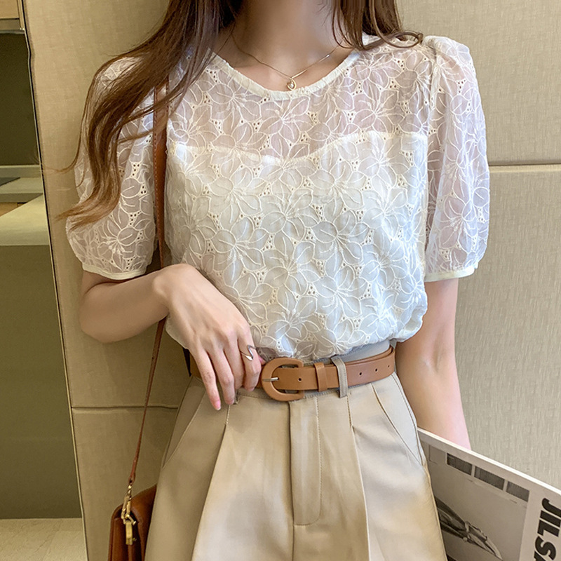 2024 여성을위한 중공 라운드 넥 레이스 티셔츠 여름 새로운 패션 퍼프 슬리브 수 놓은 탑 서양식 작은 셔츠
