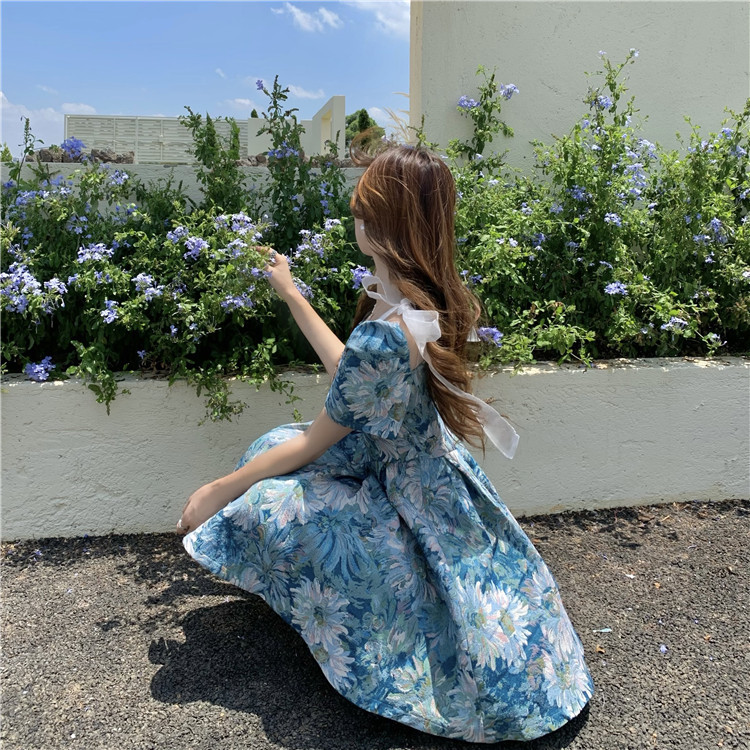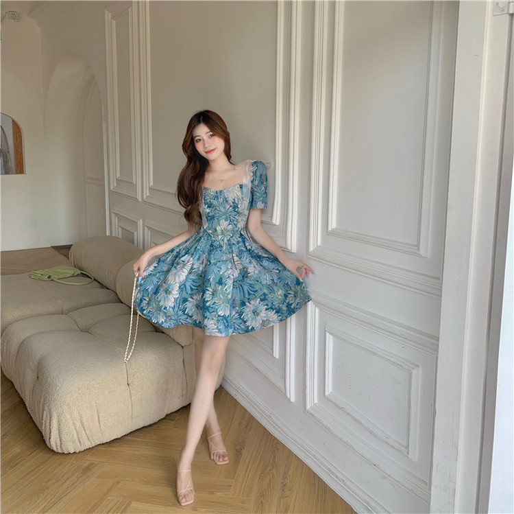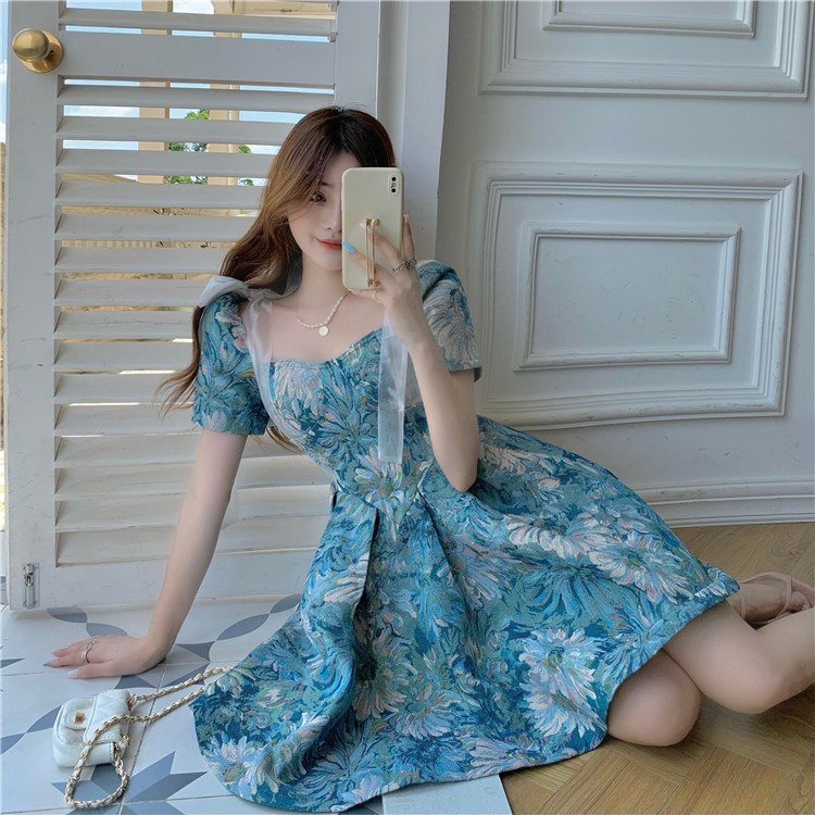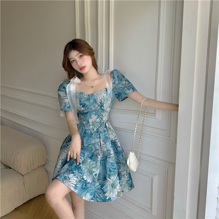 2023 여름 새로운 스타일 메쉬 활 반팔 프랑스 틈새 코트 스타일 유화 꽉 허리 푹신한 원피스 여성스토어 가기