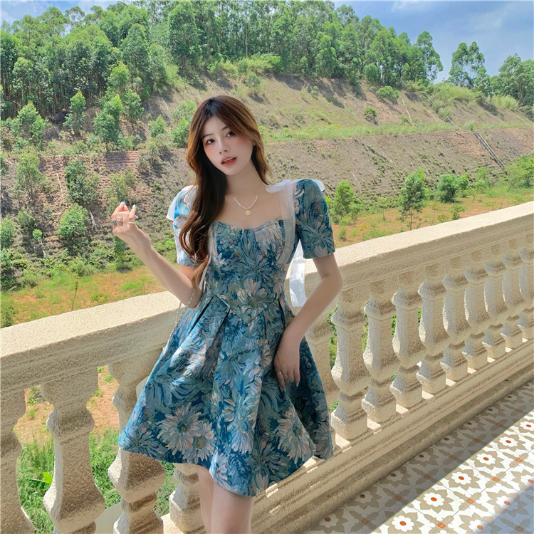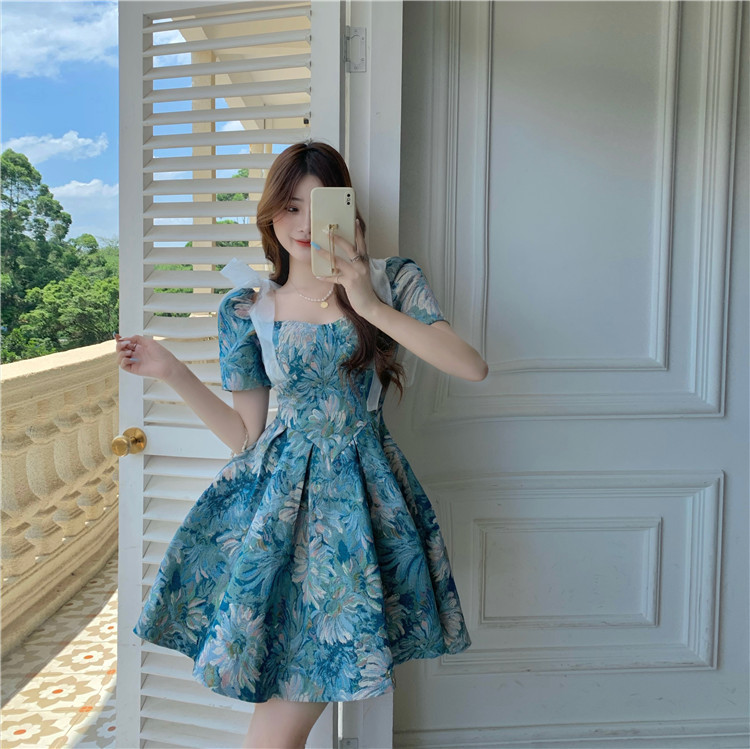 2023 여름 새로운 스타일 메쉬 활 반팔 프랑스 틈새 코트 스타일 유화 꽉 허리 푹신한 원피스 여성
