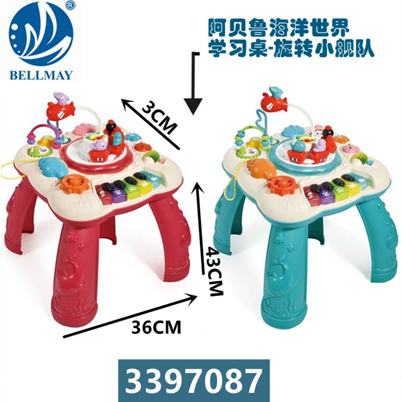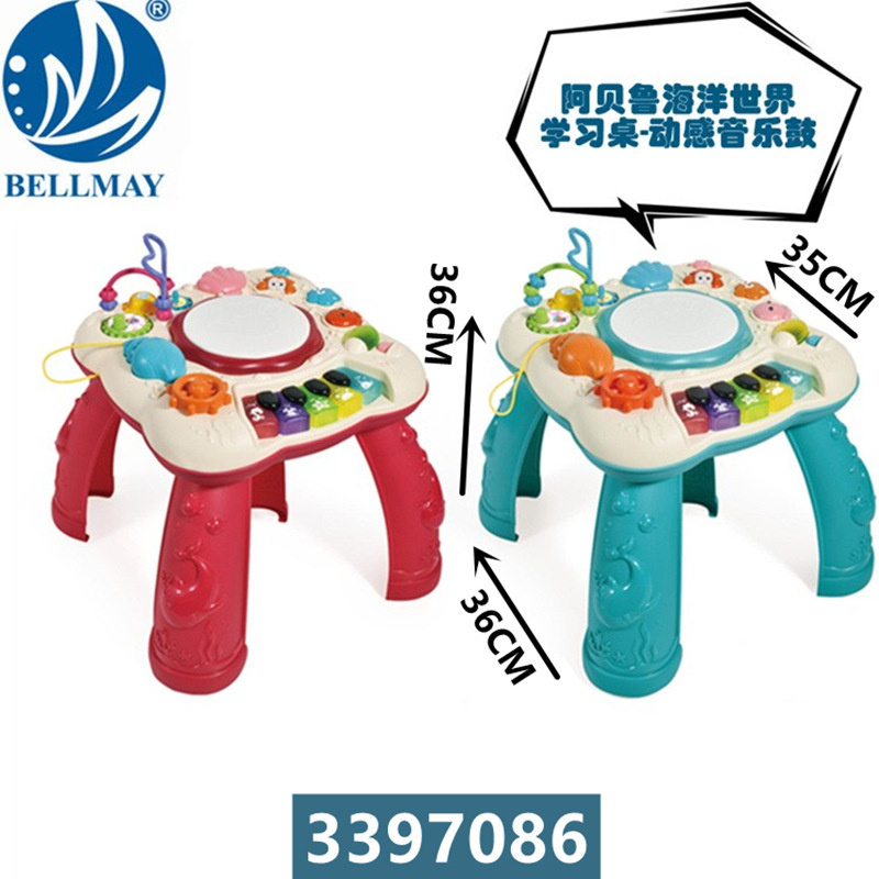 灯光,音乐,钢琴,游戏,手拍鼓 电动学习桌游戏桌 早教益智玩具学习桌 边学边玩 每一个都是好玩的小机关 小海豚为模式切换功能键按下时更改钢琴按键功能:1,钢琴功能,2,灯光打地鼠功能,3,儿歌10首,4,故事10个,5,轻音乐6首,6,动物叫声10种,7,乐器声10种