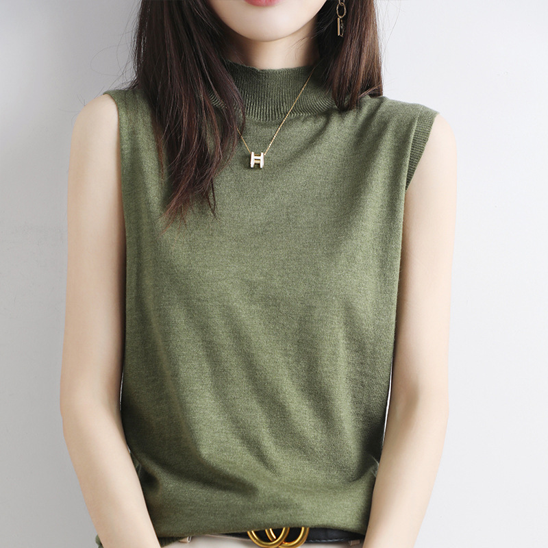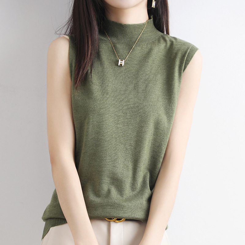 봄과 여름 민소매 베이스 풀오버 단색 패션 하프 하이 칼라 최악의 부드러운 왁스 울트라 씬 울 베이스 셔츠의 한국 스타일