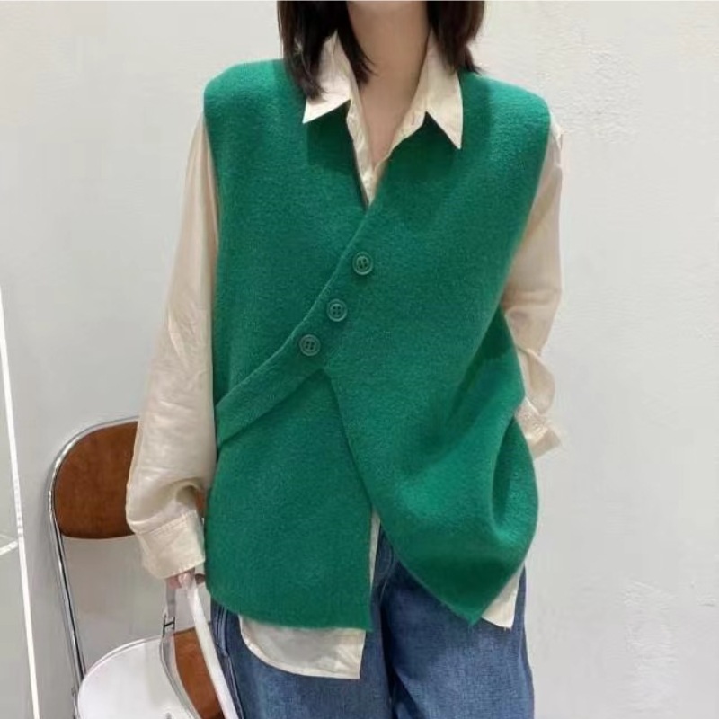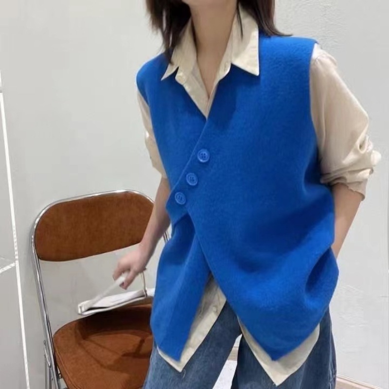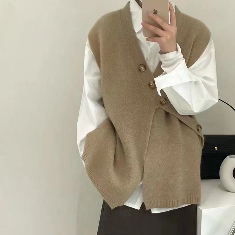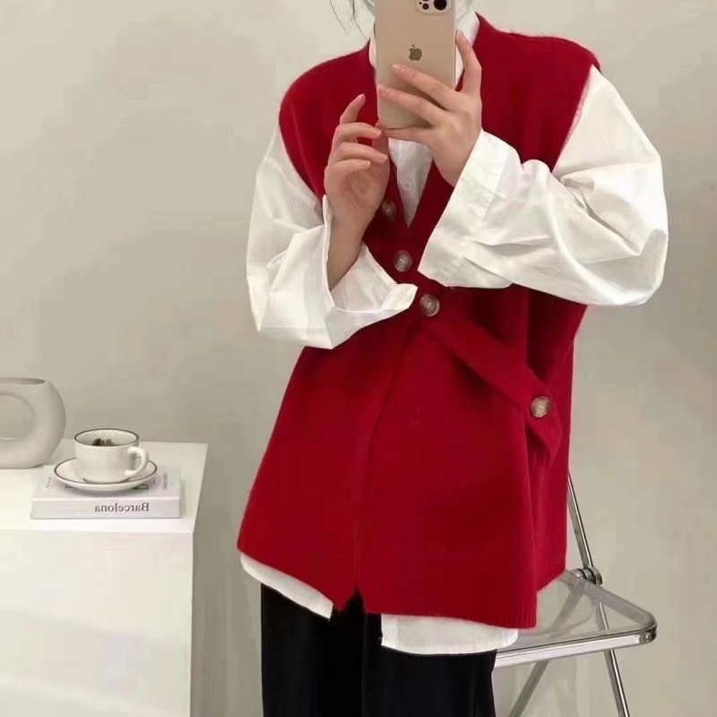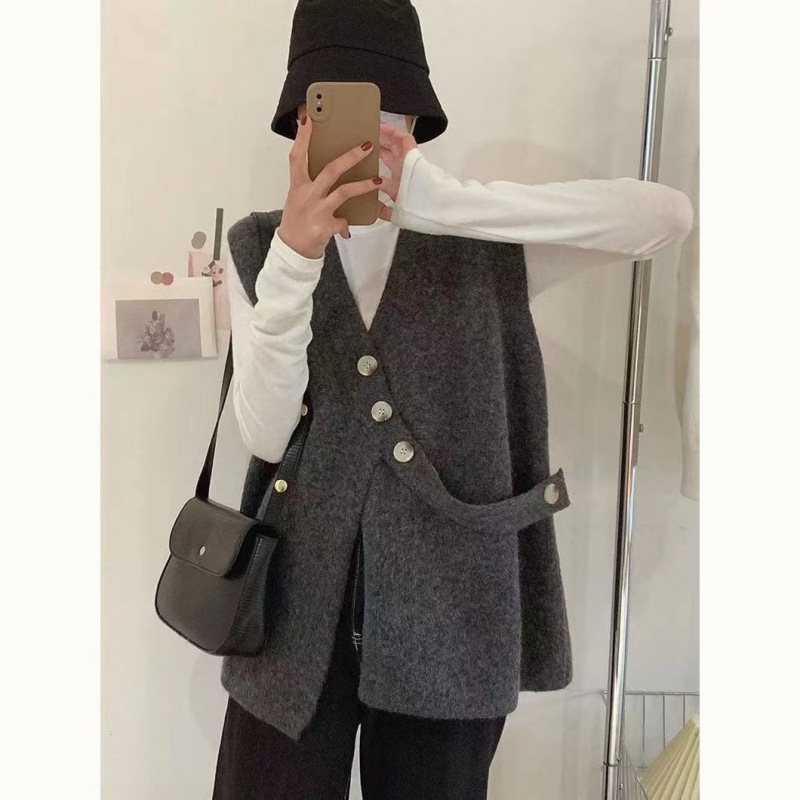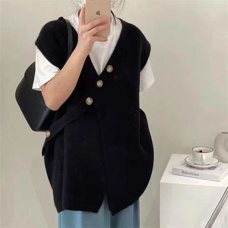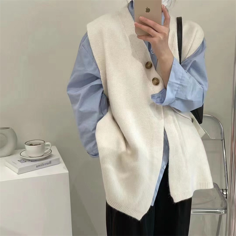 V-넥 니트 조끼 카디건 여성 가을 2022 새로운 게으른 스타일 느슨한 민소매 허리띠 스웨터 코트