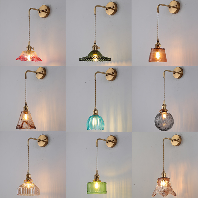 일본식 복고풍 황동 매달려 와이어 벽 램프 창조적 인 성격 호텔 방 통로 침실 침대 옆 램프 유리 벽 램프스토어 가기