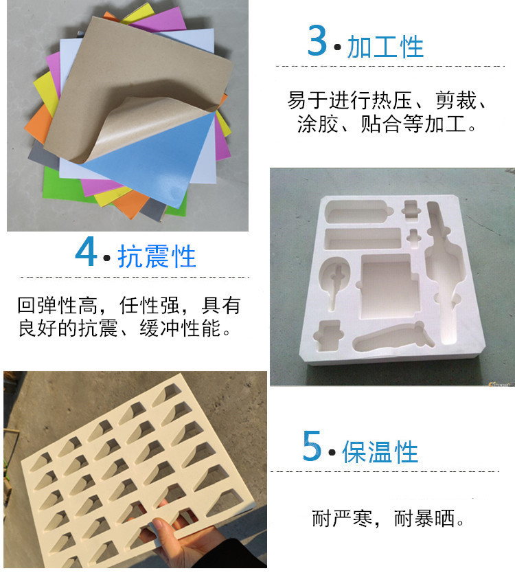 EVA橡塑制品是新型塑料发泡材料,它由eva塑胶原料发泡而成。克服了普通发泡胶易碎、变形、回复性差的缺点。具有良好的缓冲、抗震、隔音、保温、防潮、抗化学腐蚀、可塑性能佳、韧性强、循环再造、抗撞力.防滑且、不吸水等诸多优点,亦具有很好的抗化学性能,是传统包装材料的理想替代品。且符合要求,是出口产品的好选择