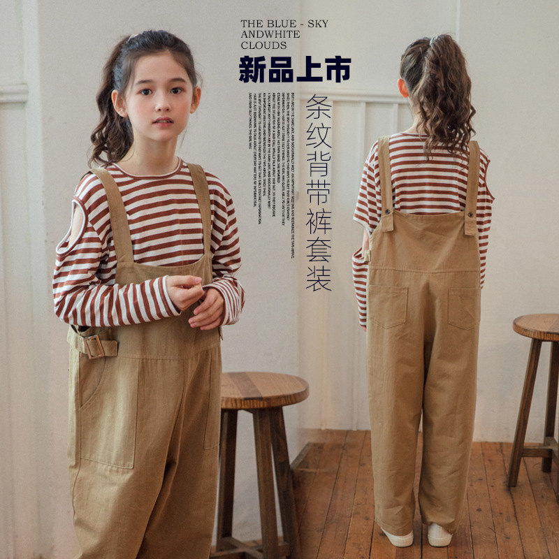 여아 봄 정장, 여아 스트라이프 티셔츠, 중대형 아동용 크로스보더 봄 가을 멜빵바지 투피스 세트, 한국 스타일 패션스토어 가기