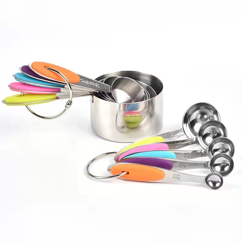 스테인레스 스틸 실리콘 손잡이 계량 컵 계량 스푼 10 개 세트 크로스 보더 베이킹 도구 계량 컵 계량 스푼 10 개 세트