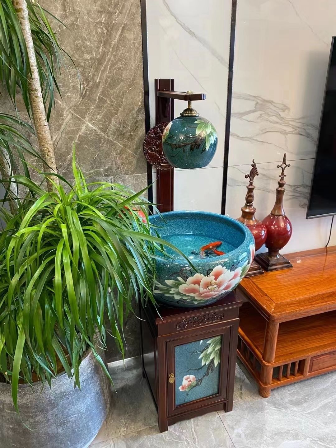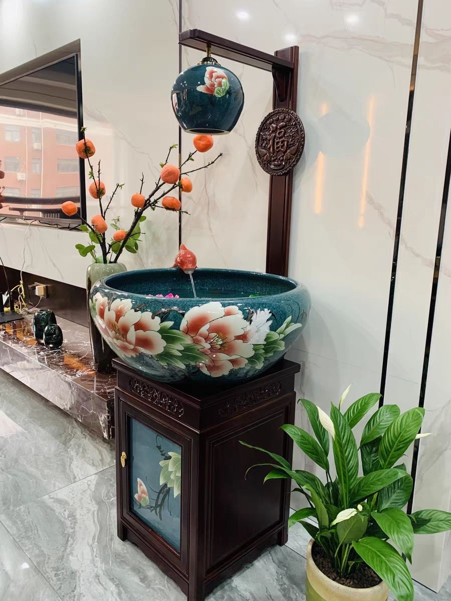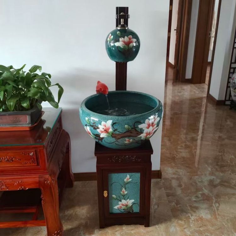 절묘한 목련 난초 세라믹 캐비닛 금붕어 탱크 바닥 스탠딩 세라믹 물고기 문화 분지 바람 물 탱크 가정용 순환 물 스프레이 거실