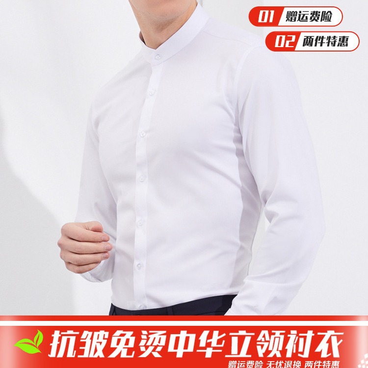 남성용 크루넥 셔츠 비즈니스 캐주얼 남성용 스탠드 칼라 셔츠 포럼웨어 젊고 중년 유행 단색 비 철 셔츠