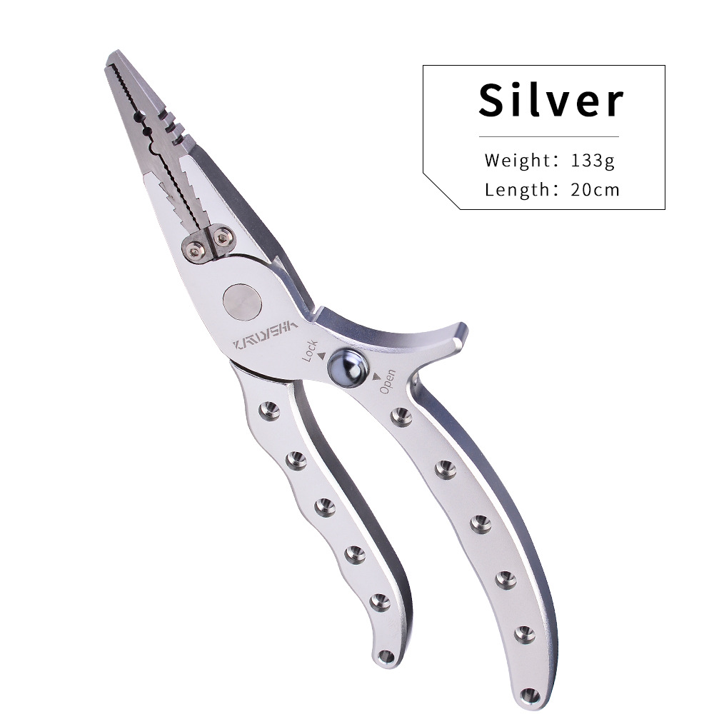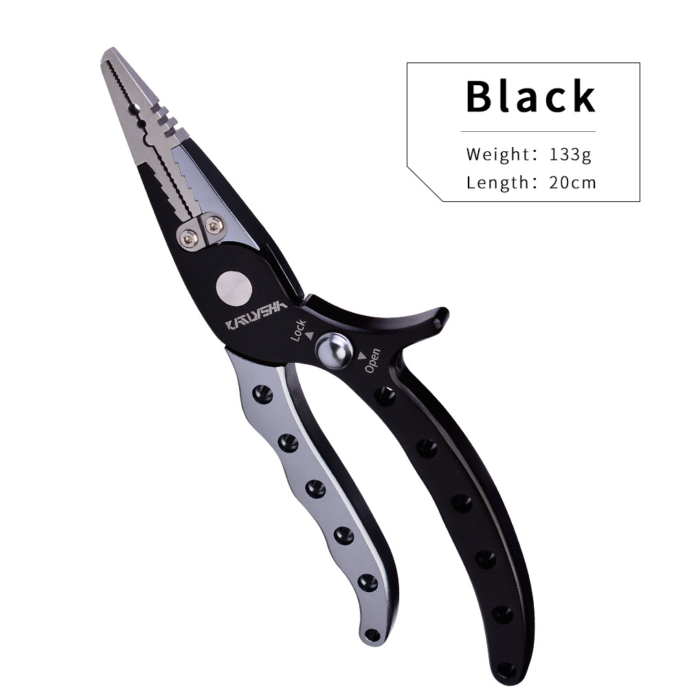 多用途:取钩,提鱼,剪线,断鱼钩,压咬铅,夹线。