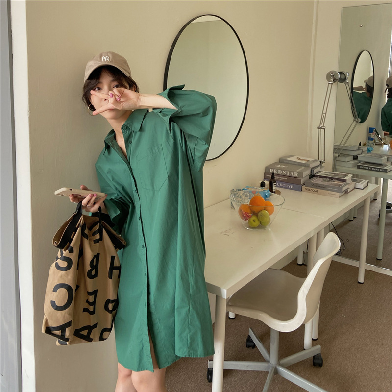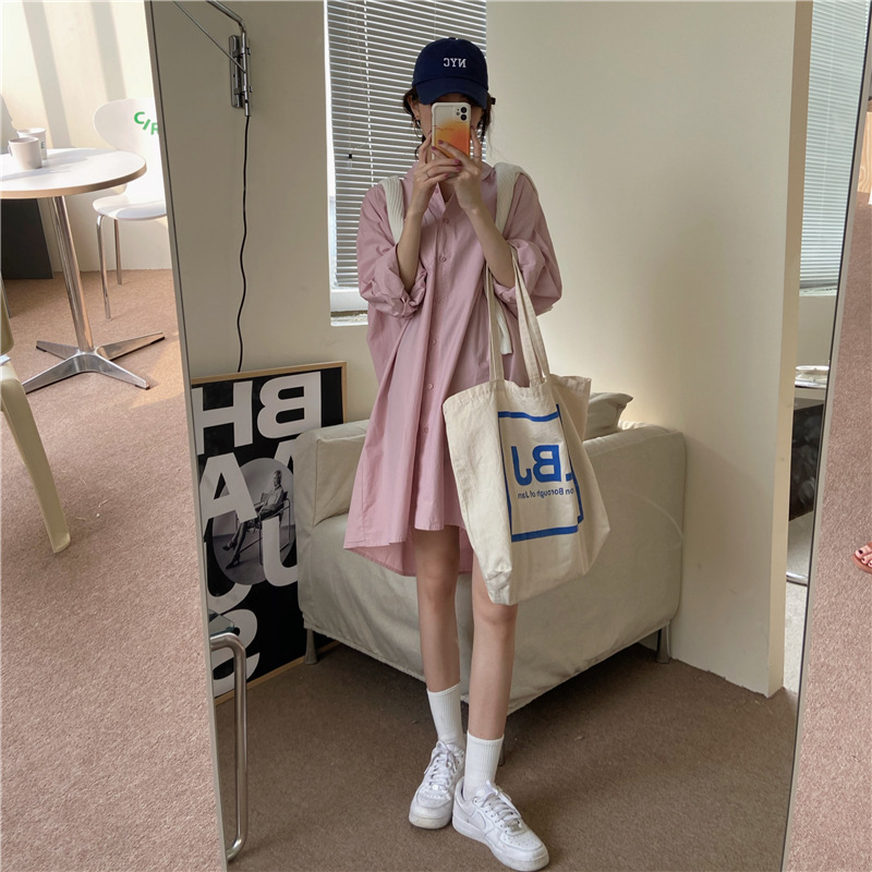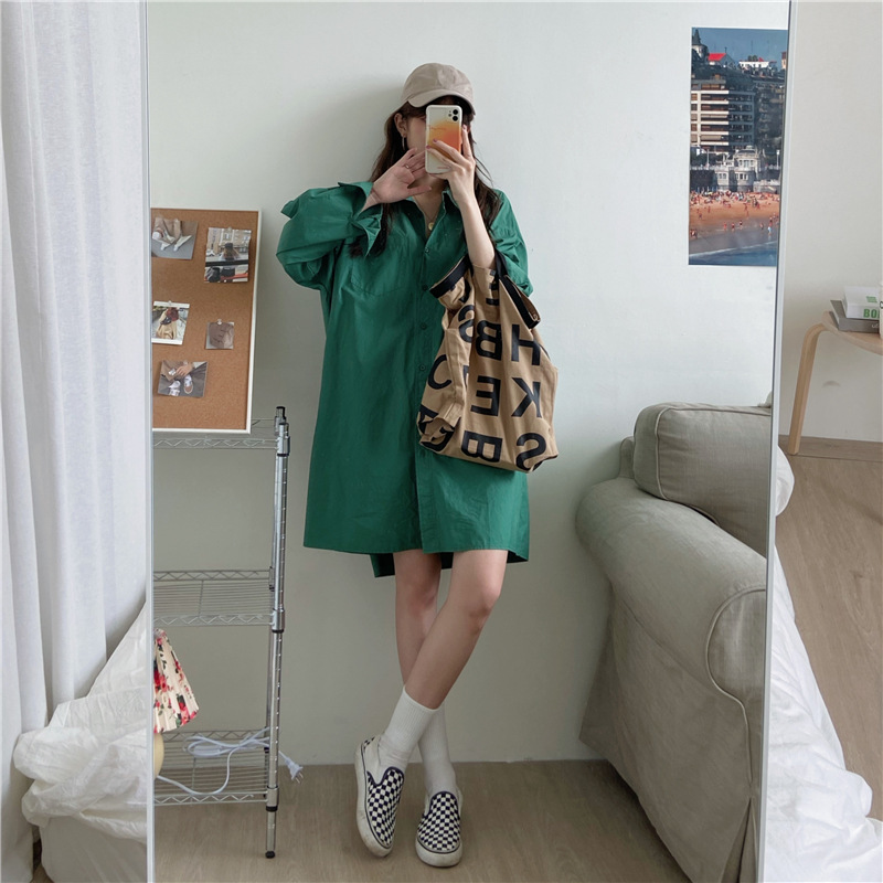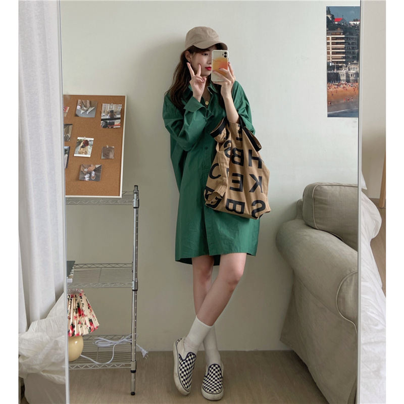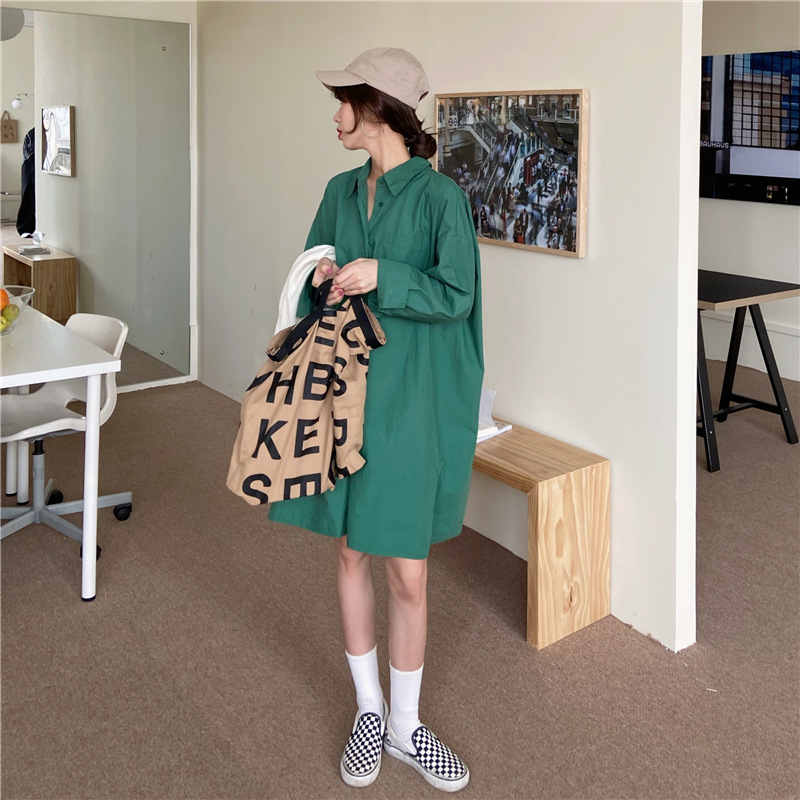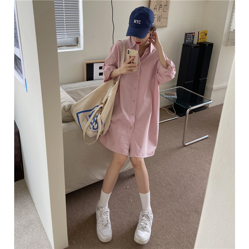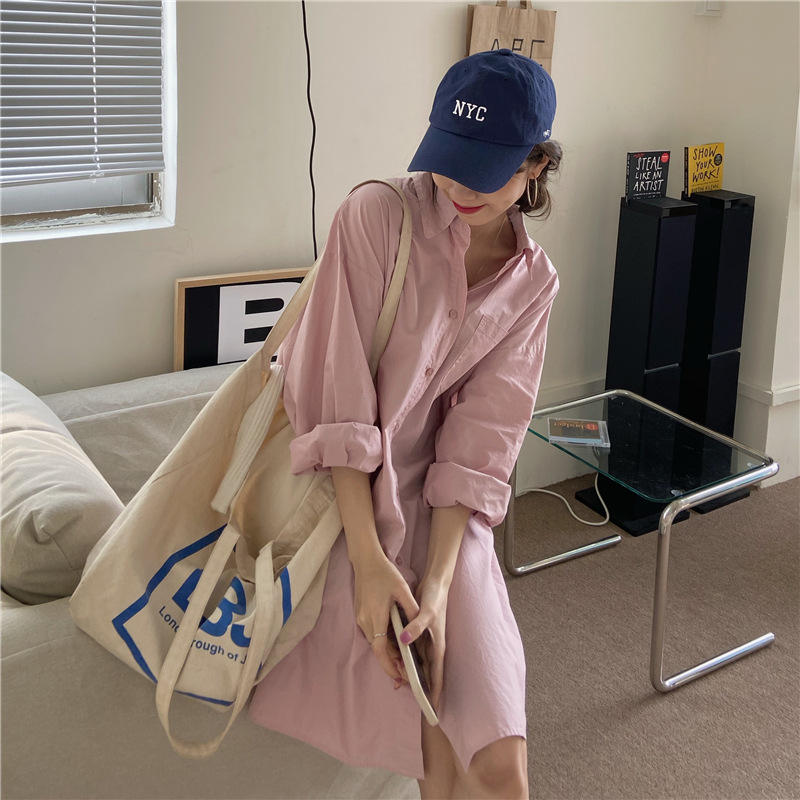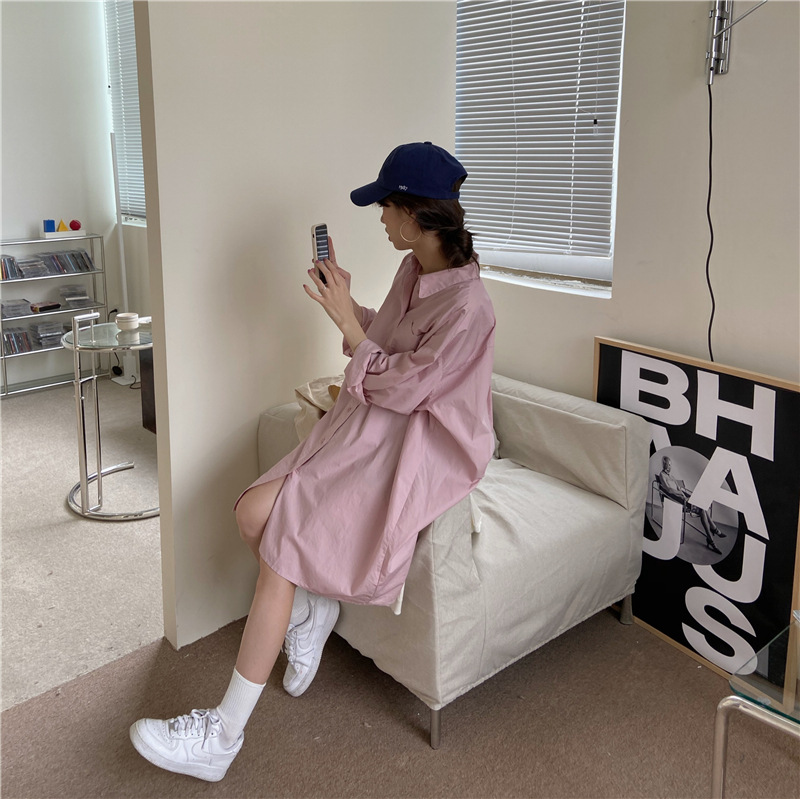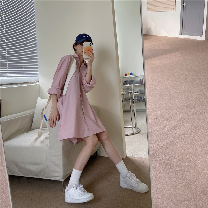 2024 가을 한국 스타일 인스 세 가지 브랜드의 루즈핏 심플한 중간 길이 긴팔 셔츠 원피스 패셔너블하고 다재다능함