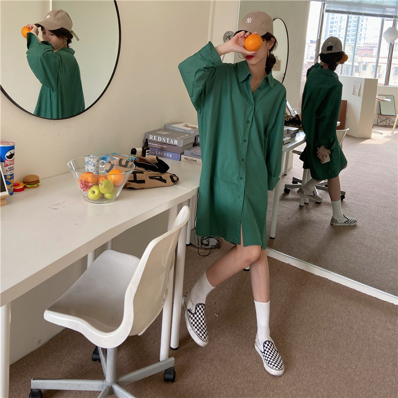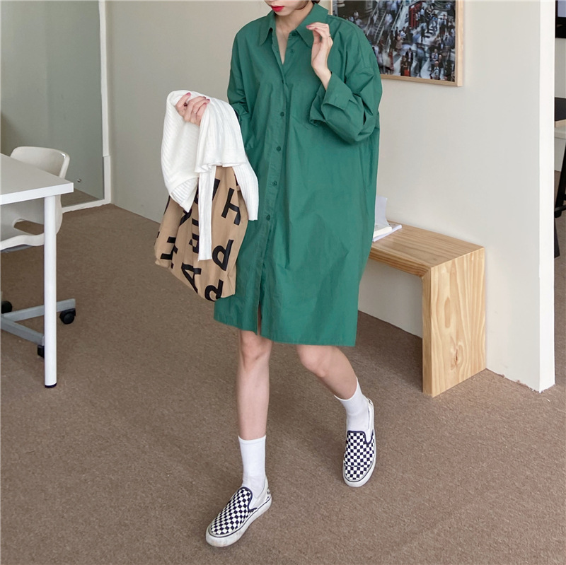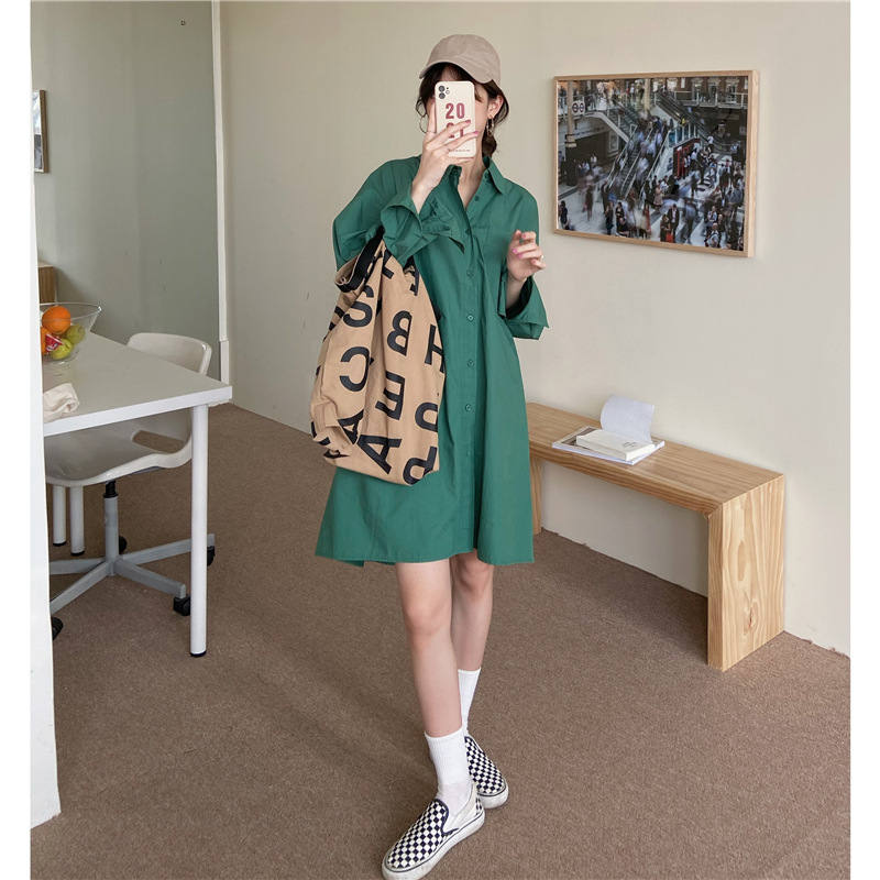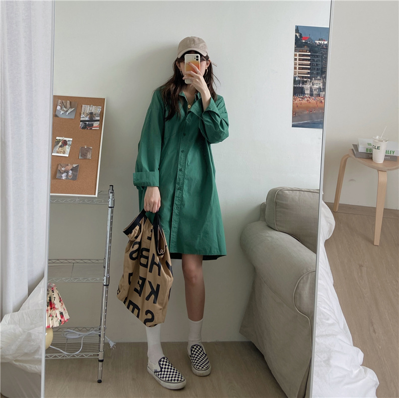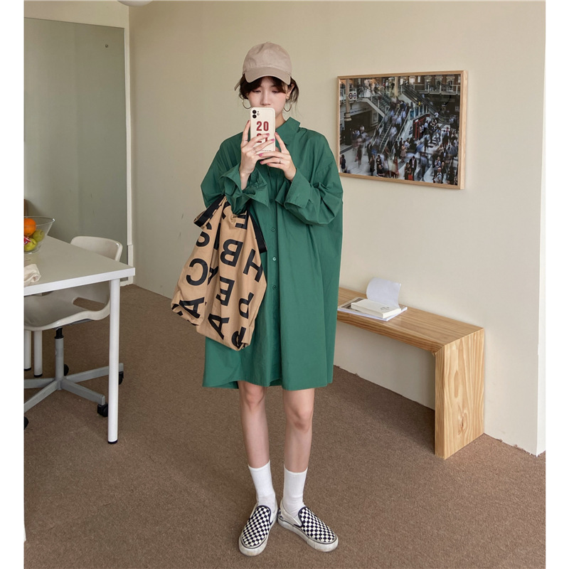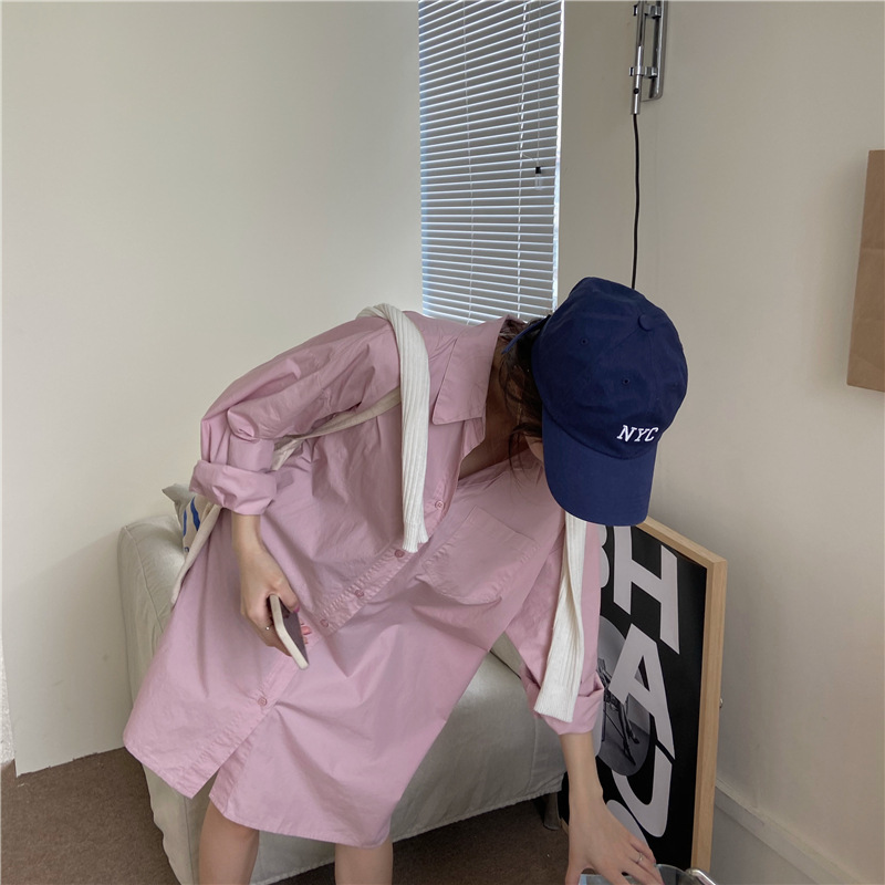 2024 가을 한국 스타일 인스 세 가지 브랜드의 루즈핏 심플한 중간 길이 긴팔 셔츠 원피스 패셔너블하고 다재다능함스토어 가기