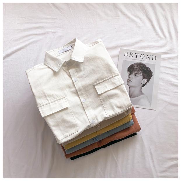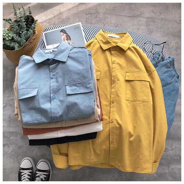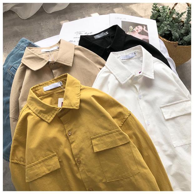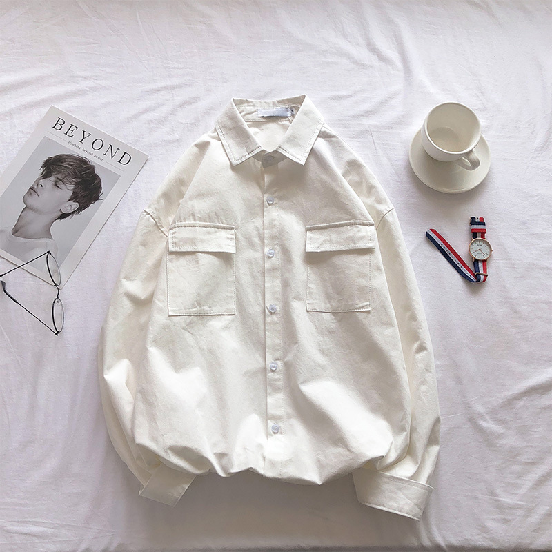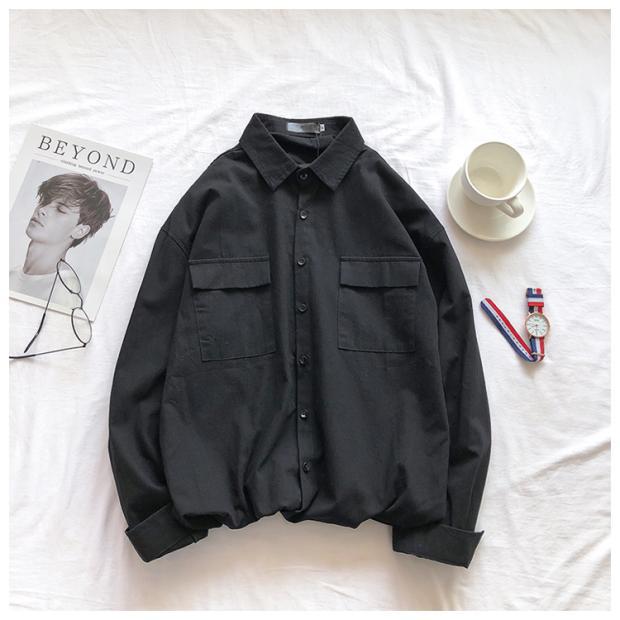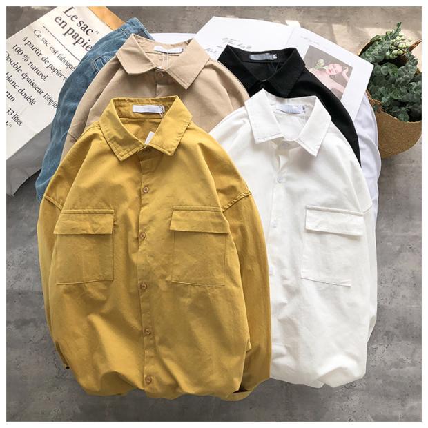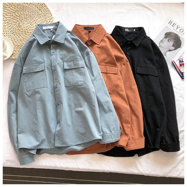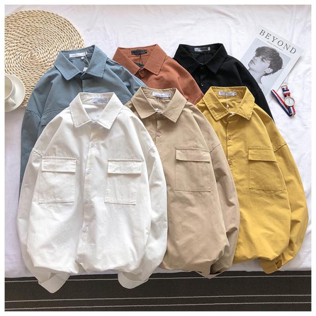 일본식 단색 작업 셔츠 남자의 봄과 가을 느슨한 간단한 포켓 셔츠 유행 Duffian 잘 생긴 캐주얼 긴팔 재킷스토어 가기