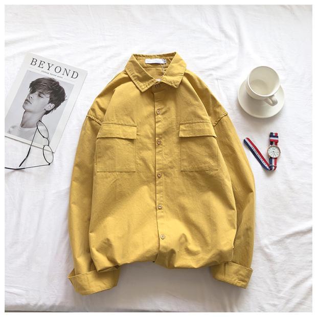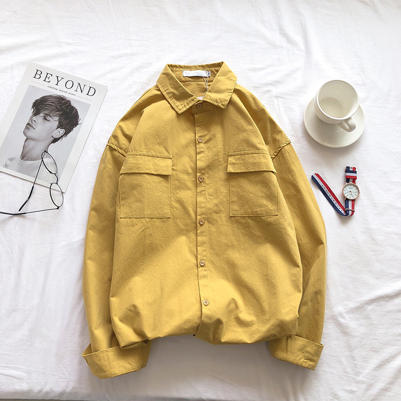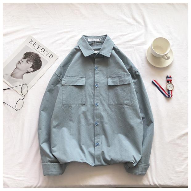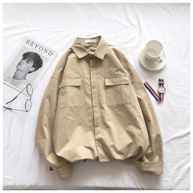 일본식 단색 작업 셔츠 남자의 봄과 가을 느슨한 간단한 포켓 셔츠 유행 Duffian 잘 생긴 캐주얼 긴팔 재킷