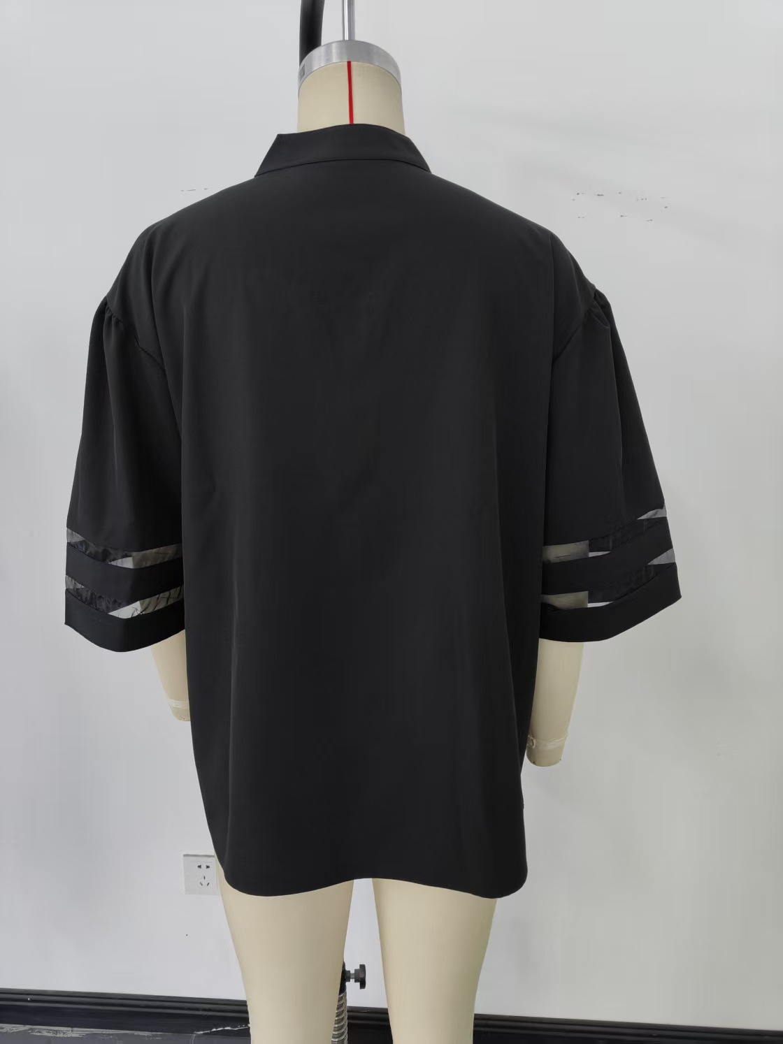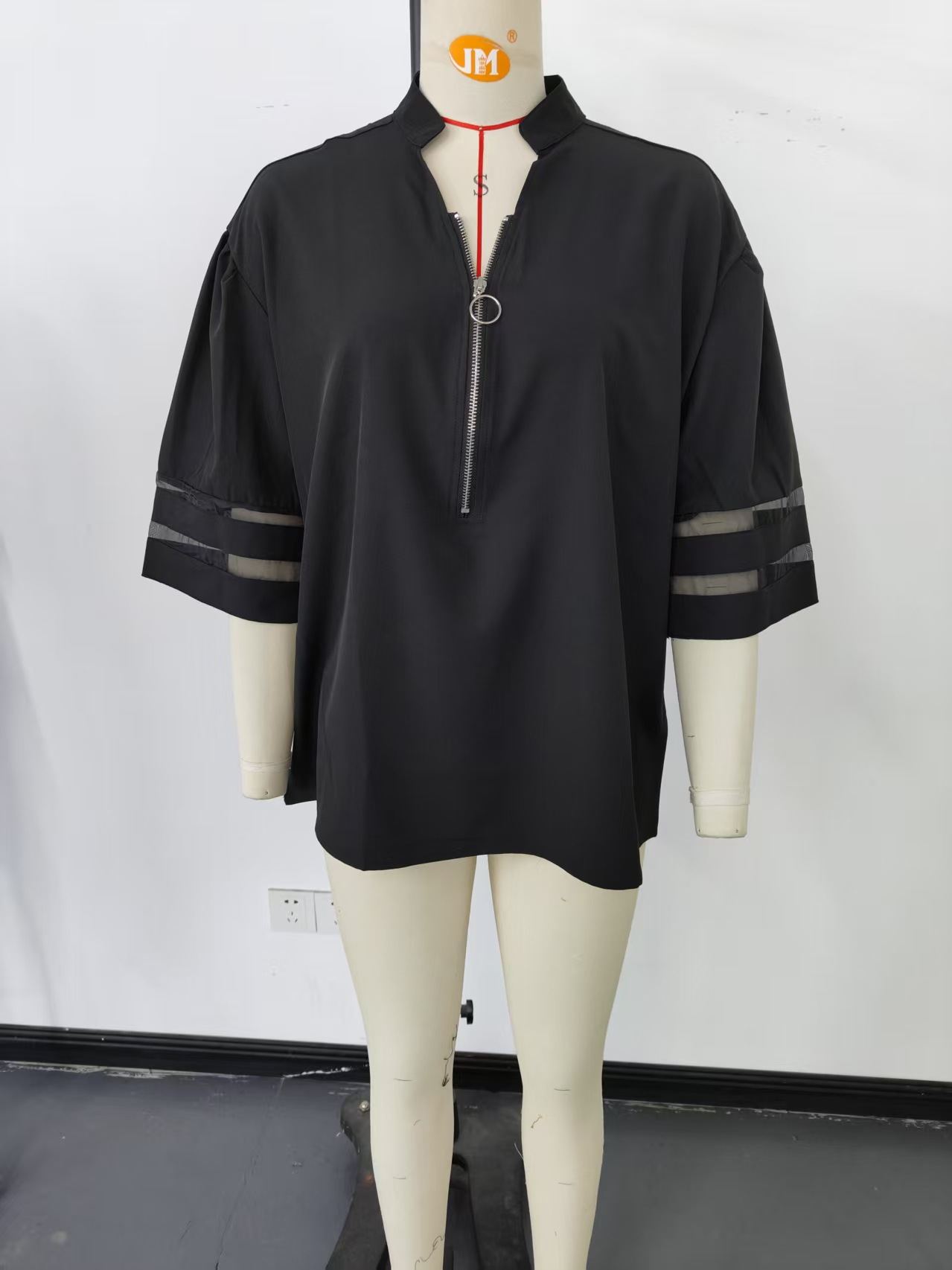 2025 유럽과 미국의 아마존 새로운 v 넥 지퍼 셔츠 하프 벨 슬리브 메쉬 스플 라이스 루즈 캐주얼 셔츠 여성용스토어 가기