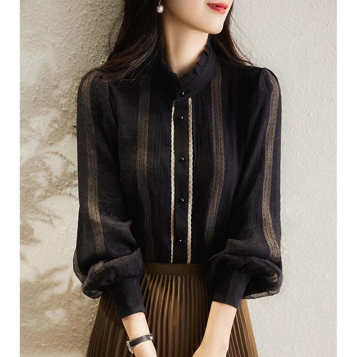 이른 봄 프랑스 곰팡이 + 레이스 스몰 스탠드 칼라 더블 레이어 디자인 여성용 싱글 브레스트 긴팔 셔츠 ELCY51589
