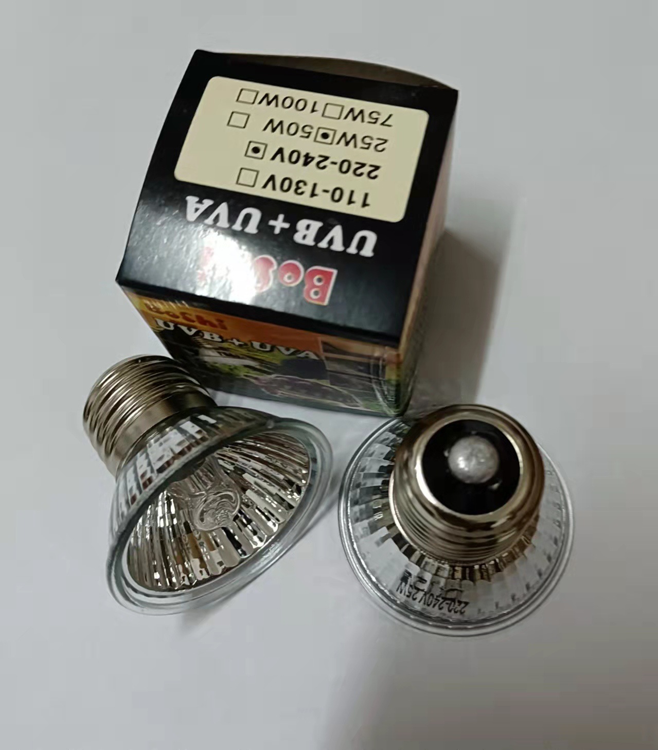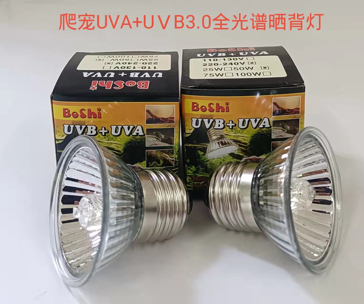 我店有L优惠价。乌龟爬宠灯泡尺寸:50*50MM.产品可配任何爬宠灯架,如要美标,欧标,请注明,我厂可以专业定做各种型号灯架,灯泡,UVB灯,贴牌加工。特别注意:产品是加热灯。特别注意周围易燃物。