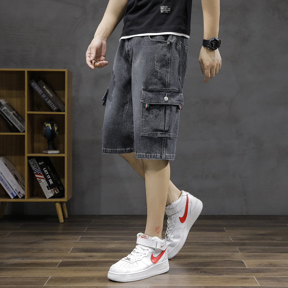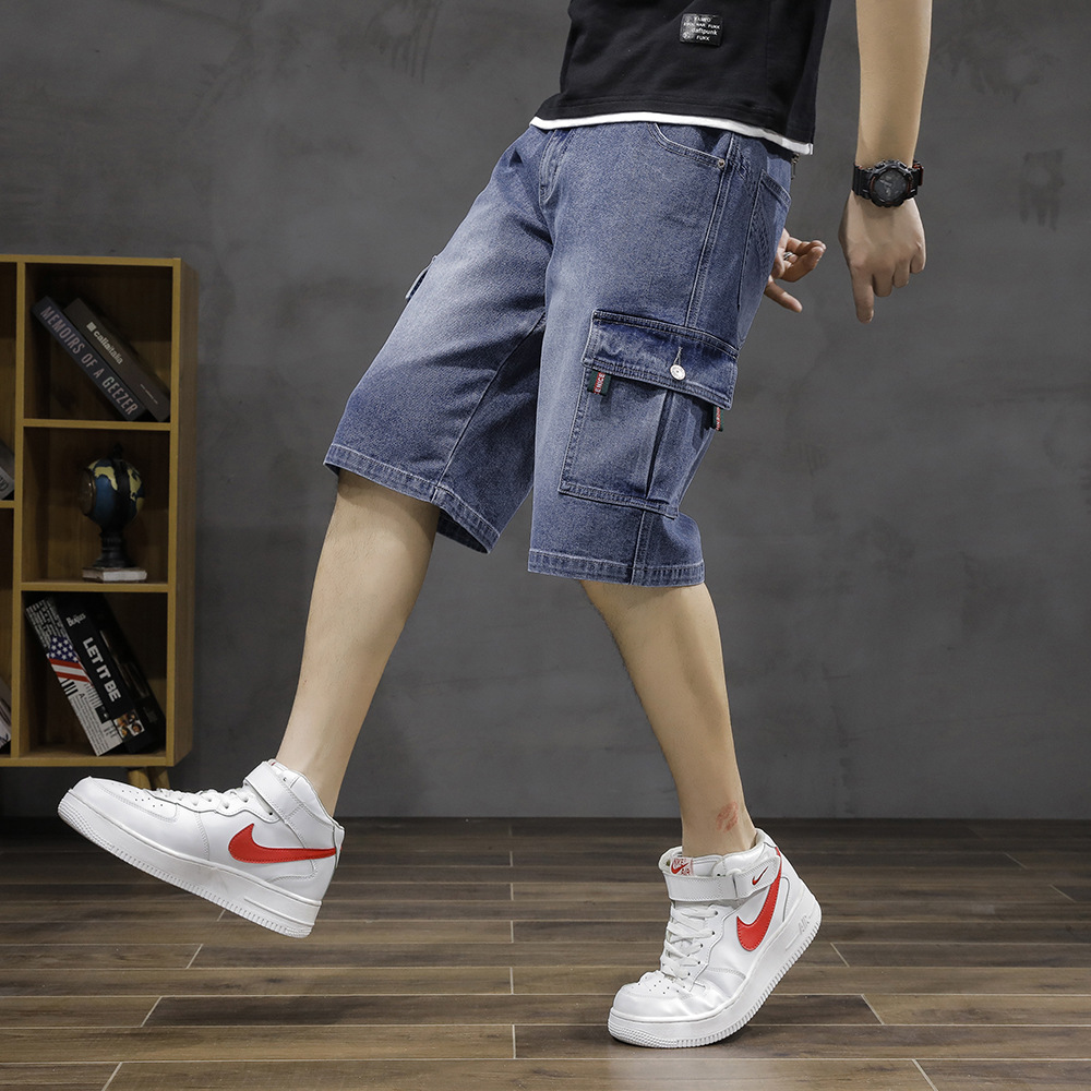 2025 여름 남성 작업복 반바지 데님 반바지 남성 트렌디 루즈핏 대형 멀티 포켓 중간 길이 바지 캐주얼 수출용스토어 가기