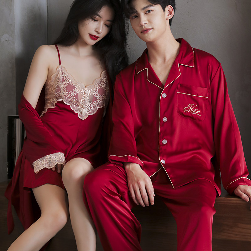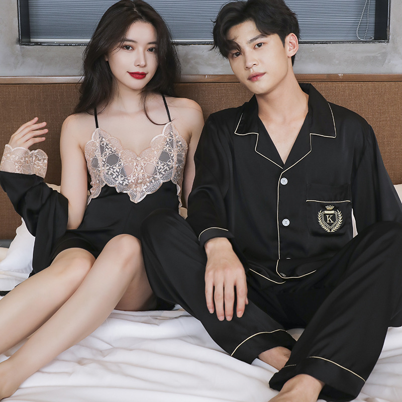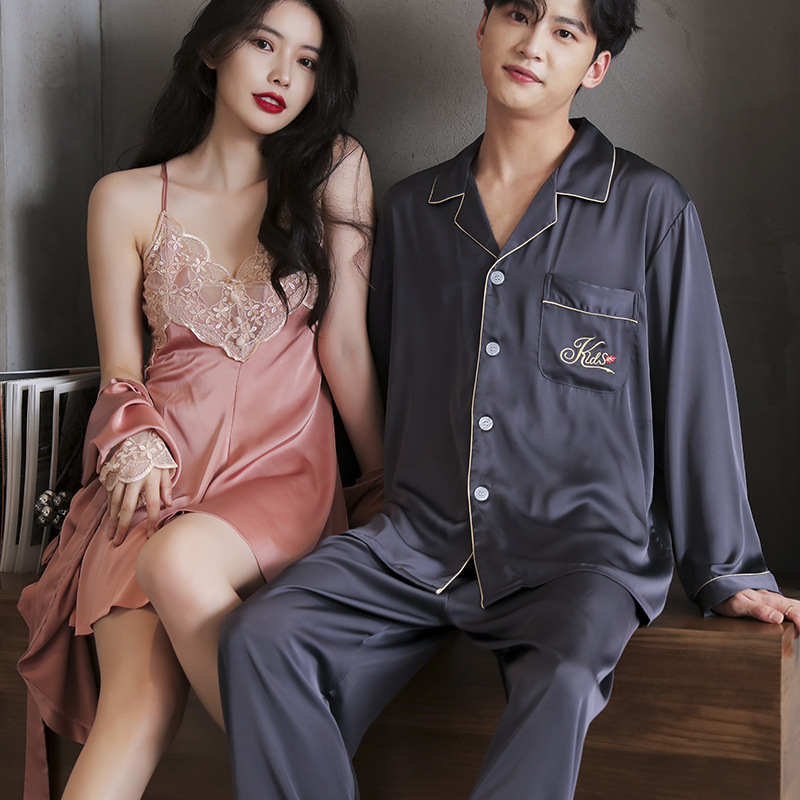 가을과 겨울 아이스 실크 신혼 커플 잠옷 가디건 긴 소매 남자의 잠옷 여자의 긴 슬링 잠옷 가정 옷 세트스토어 가기