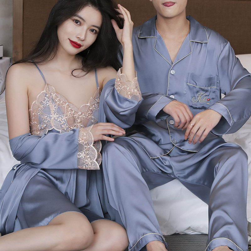 가을과 겨울 아이스 실크 신혼 커플 잠옷 가디건 긴 소매 남자의 잠옷 여자의 긴 슬링 잠옷 가정 옷 세트