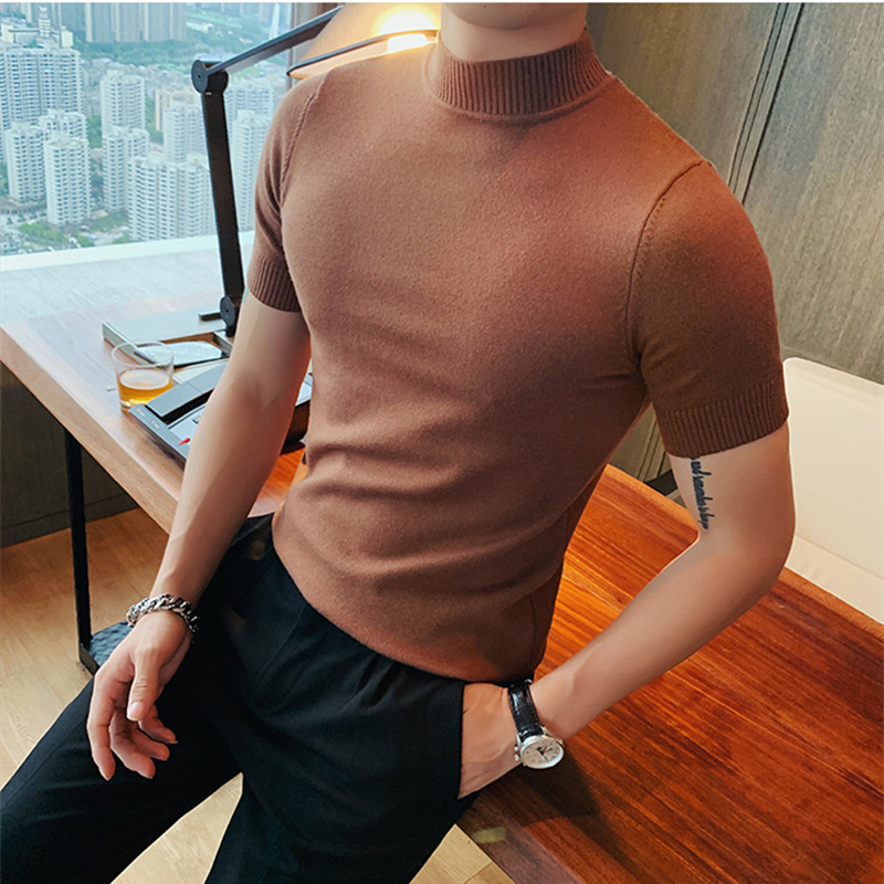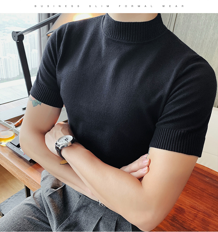 0820-스페셜 540 세미 하이 칼라 니트 바닥 셔츠 남성용 봄과 여름 슬림 솔리드 컬러 풀오버 반팔 티셔츠