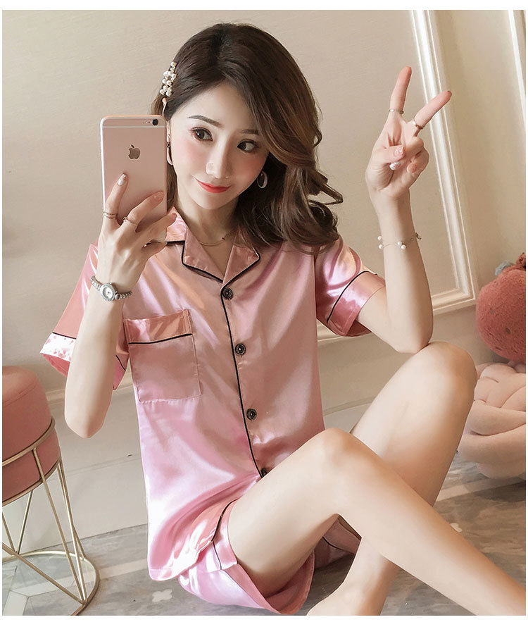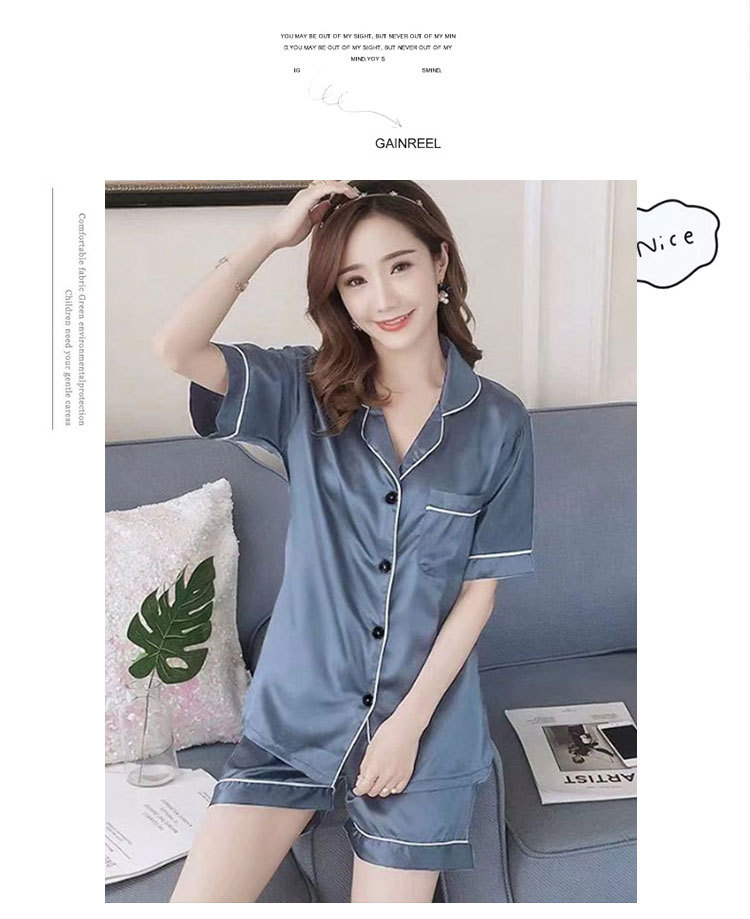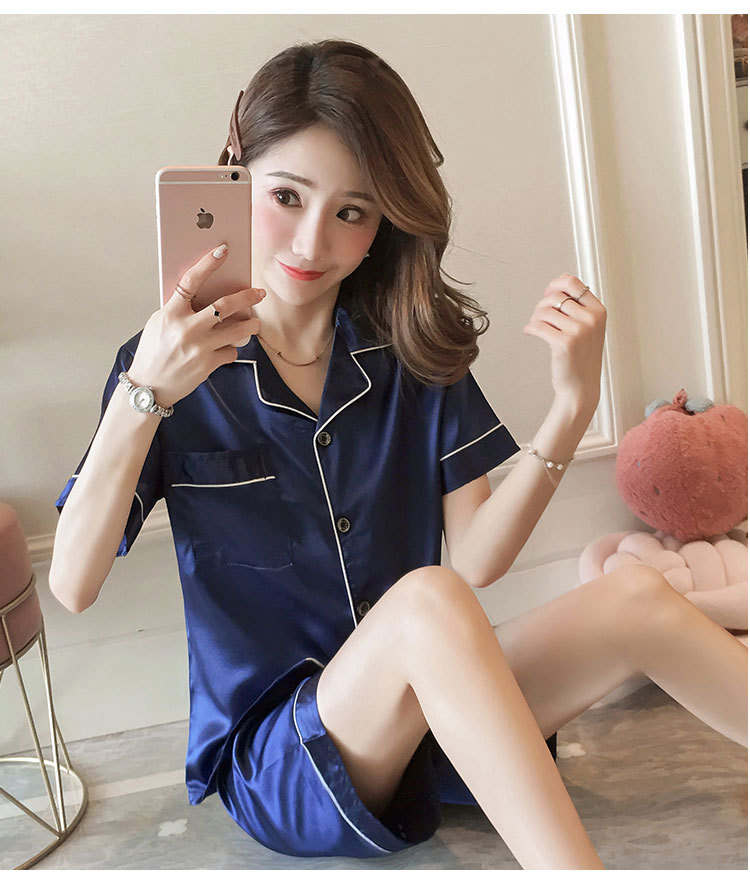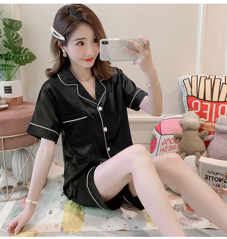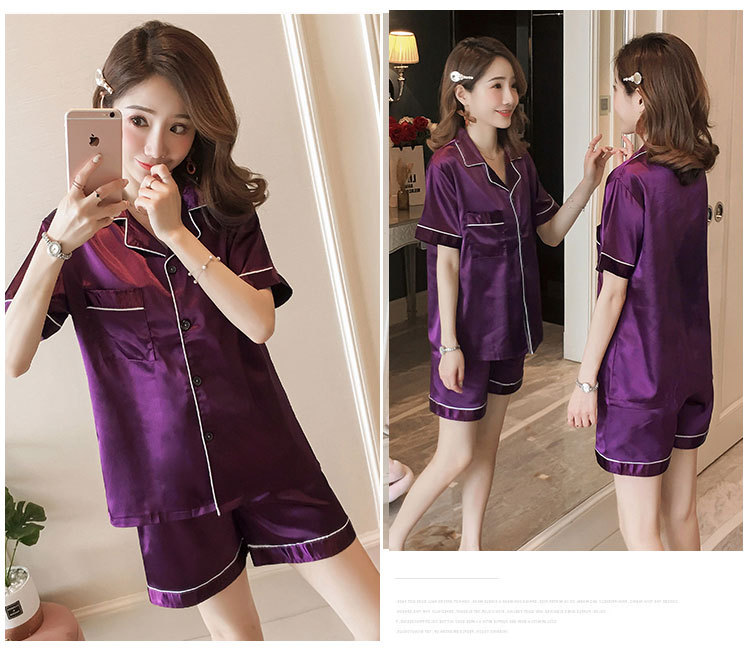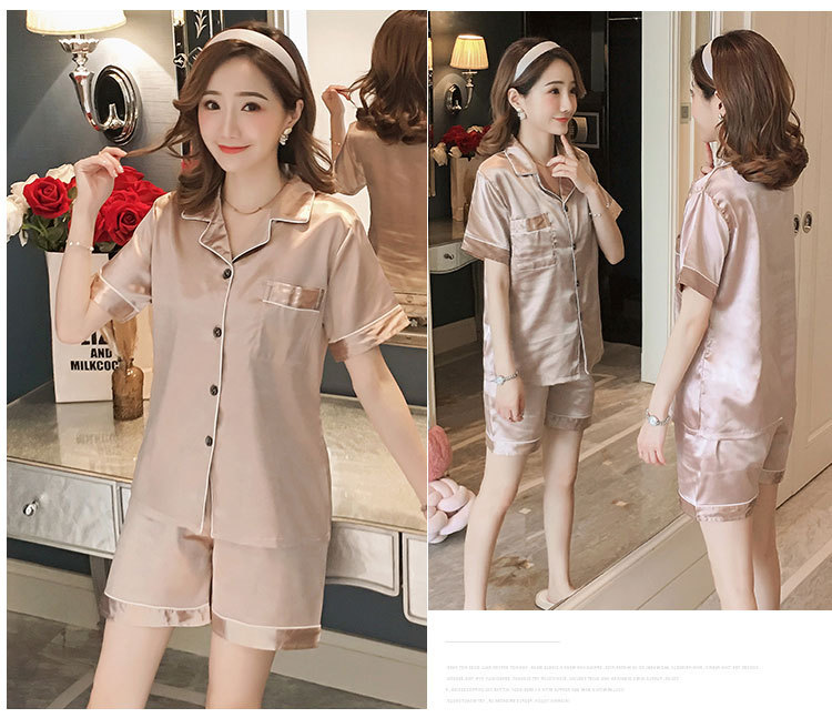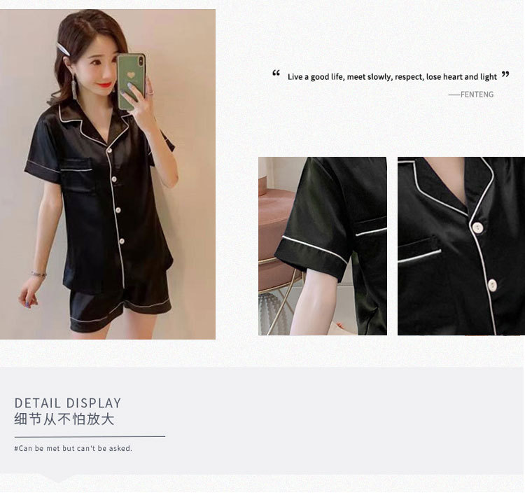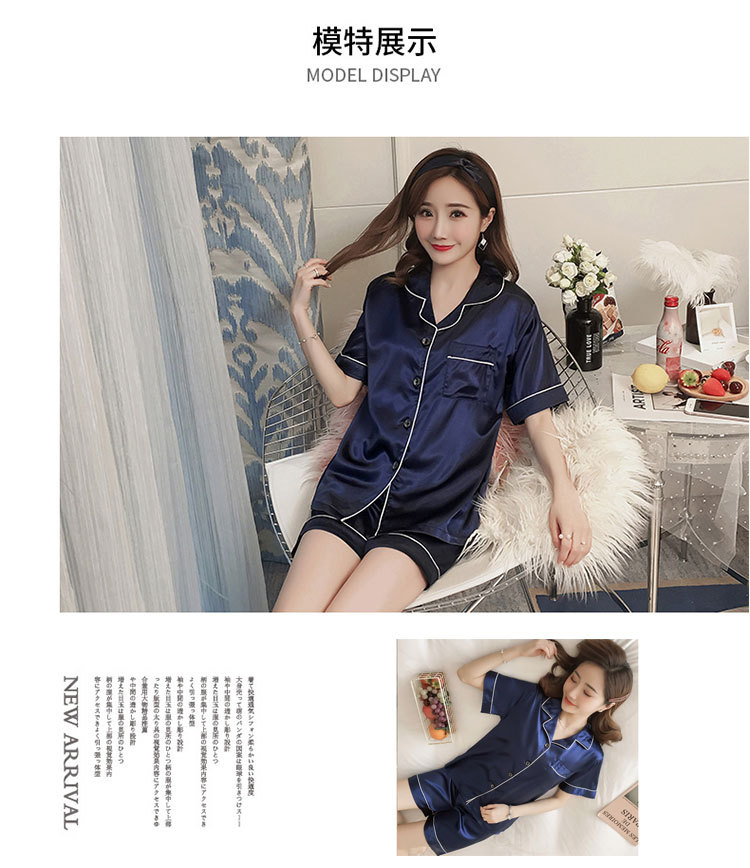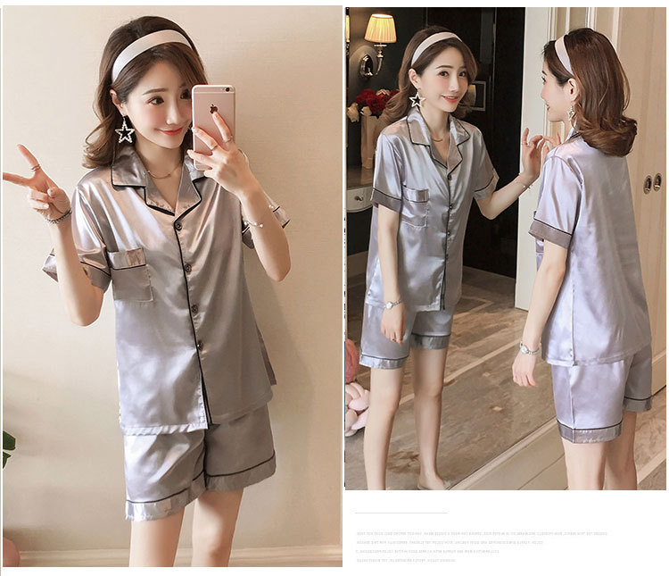 아이스 실크 잠옷 여자의 여름 카디건 반팔 반바지 실크 느슨한 플러스 사이즈 크로스 보더 가정 옷 세트 M-5XL스토어 가기