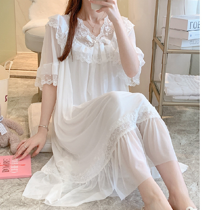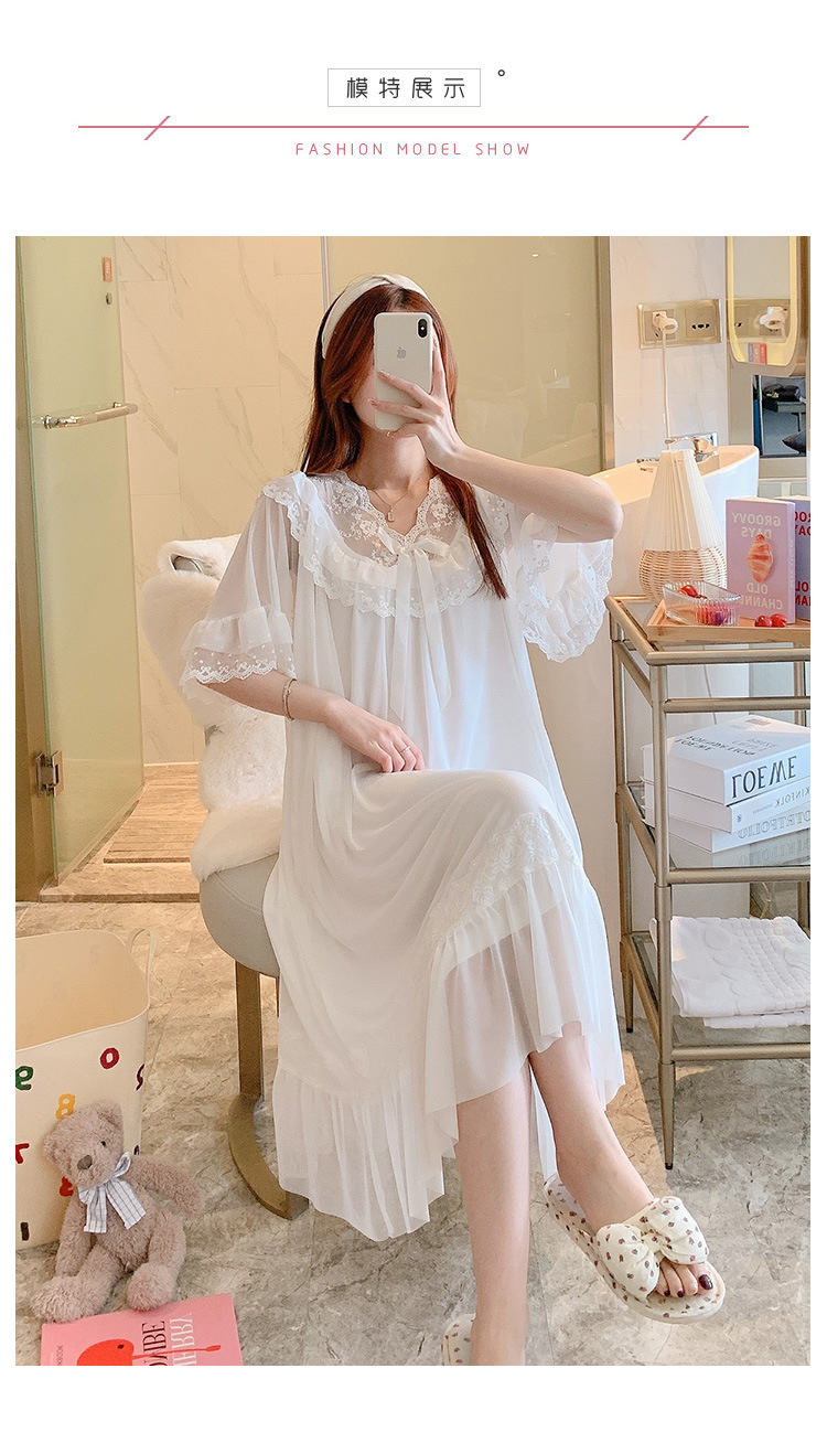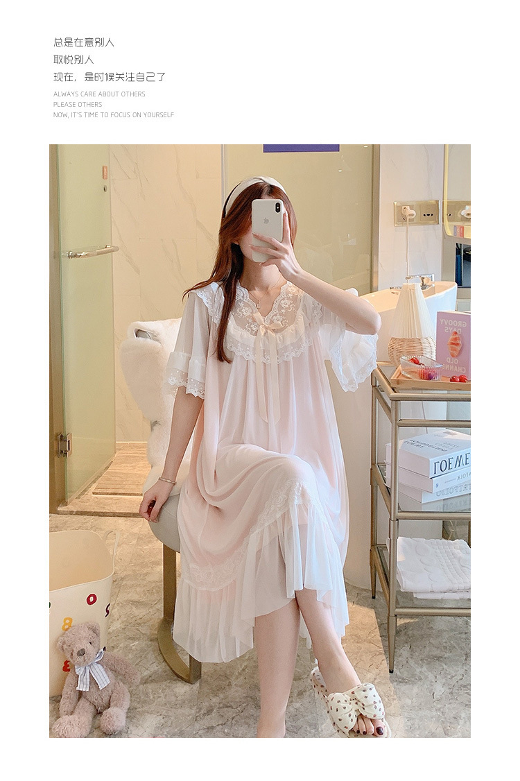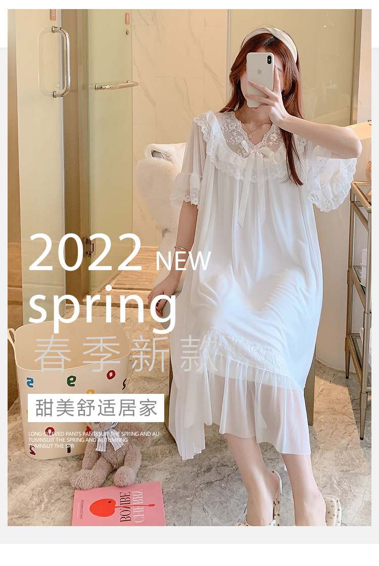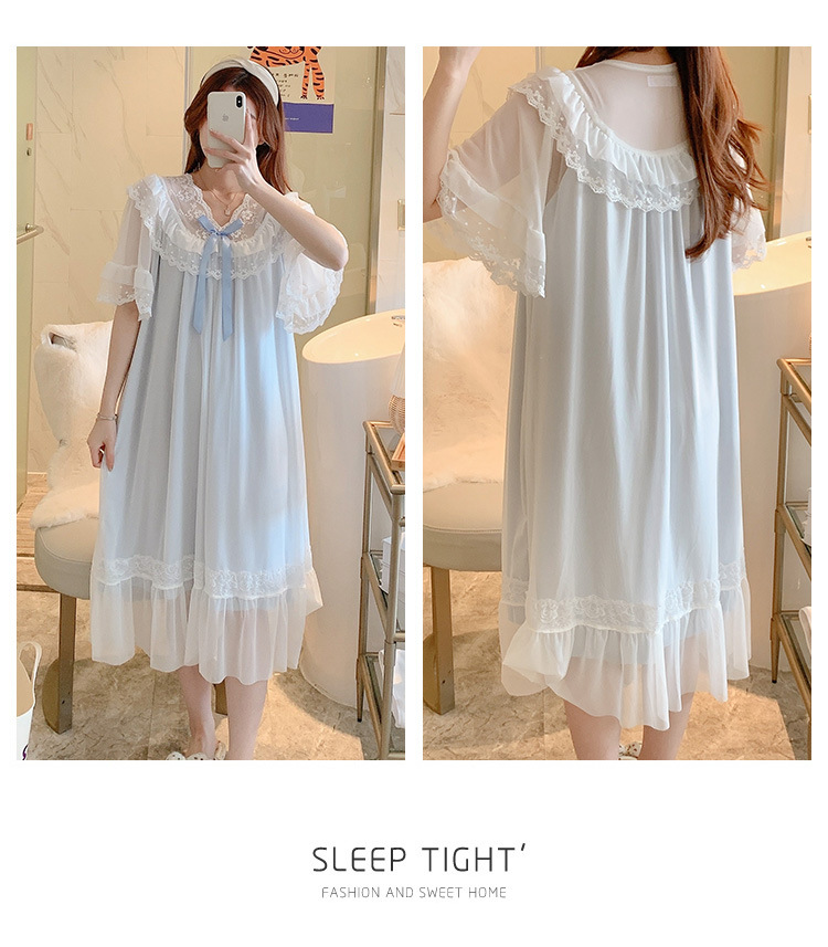 여름 새로운 한국 스타일 얇은 달콤한 귀여운 잠옷 섹시한 메쉬 홈 옷 짧은 소매 잠옷 여성 도매스토어 가기
