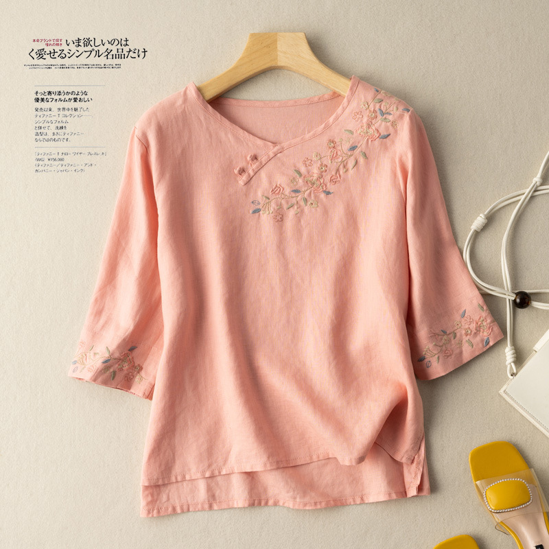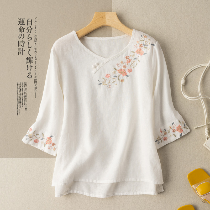 세미슬리브 자수 단추 예술적 레트로 스타일 셔츠 2025 봄 여름 신상 면마 티셔츠 여성용 순면 자수 상의스토어 가기